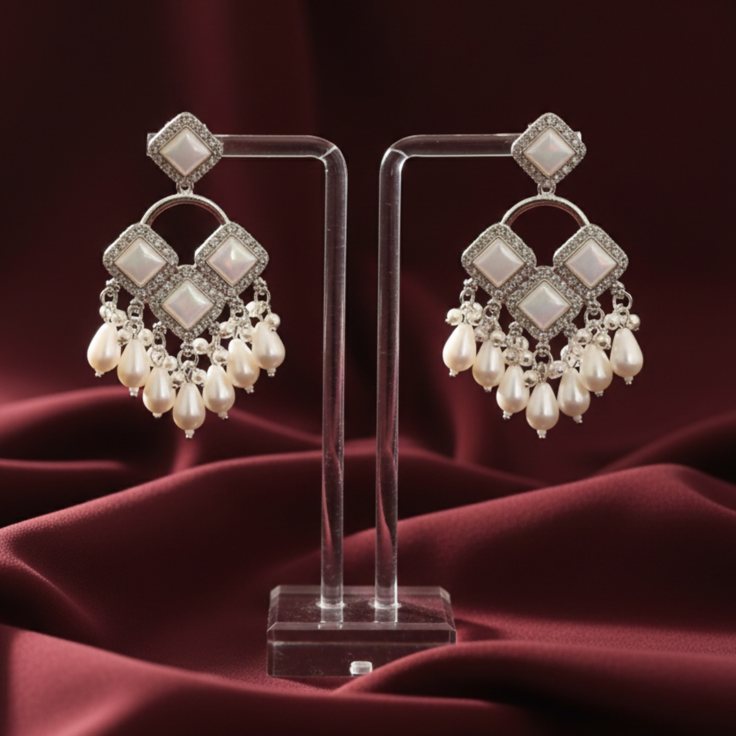 Elegant Silver Plated Chandelier Earrings Featuring Square Crystals and White Teardrop Beads