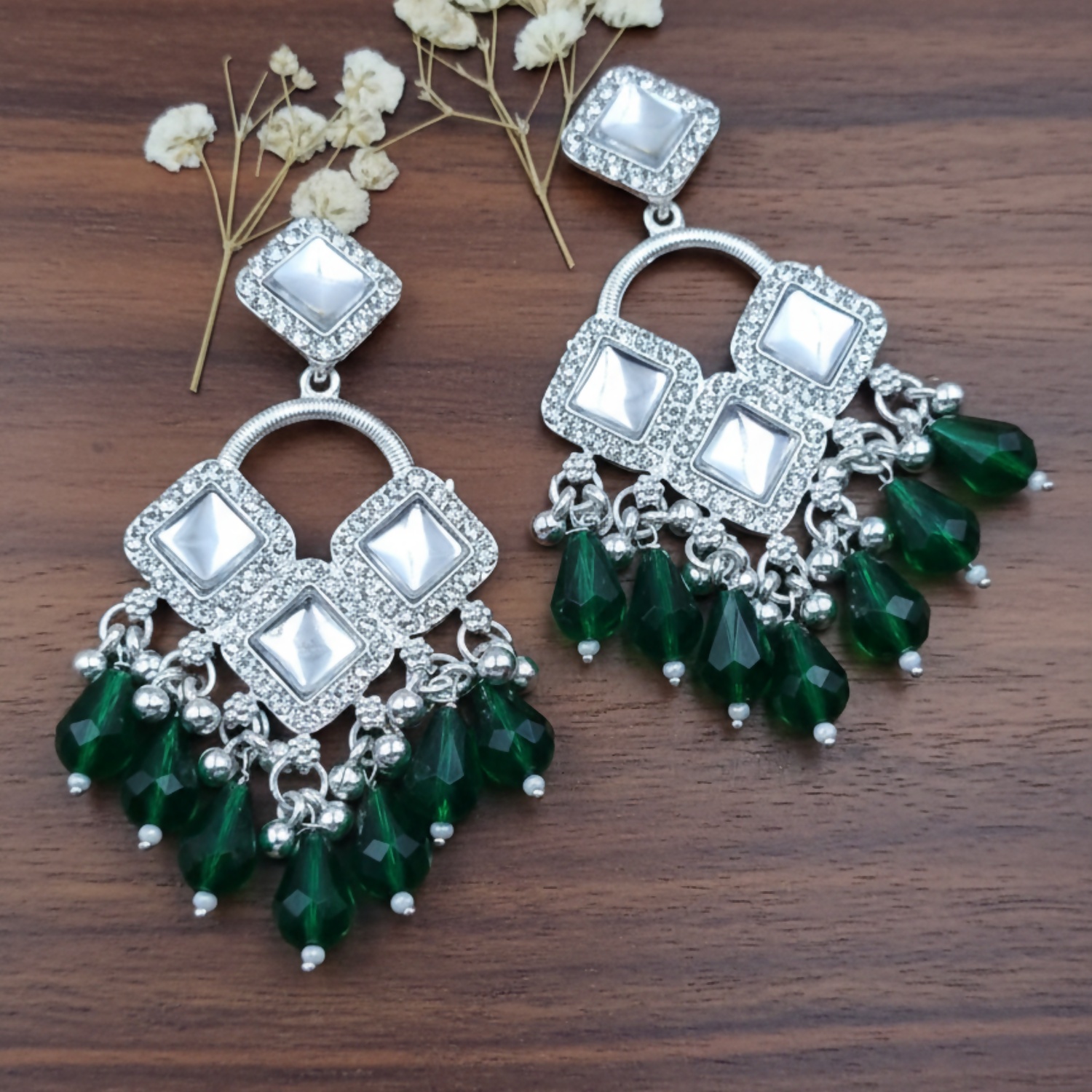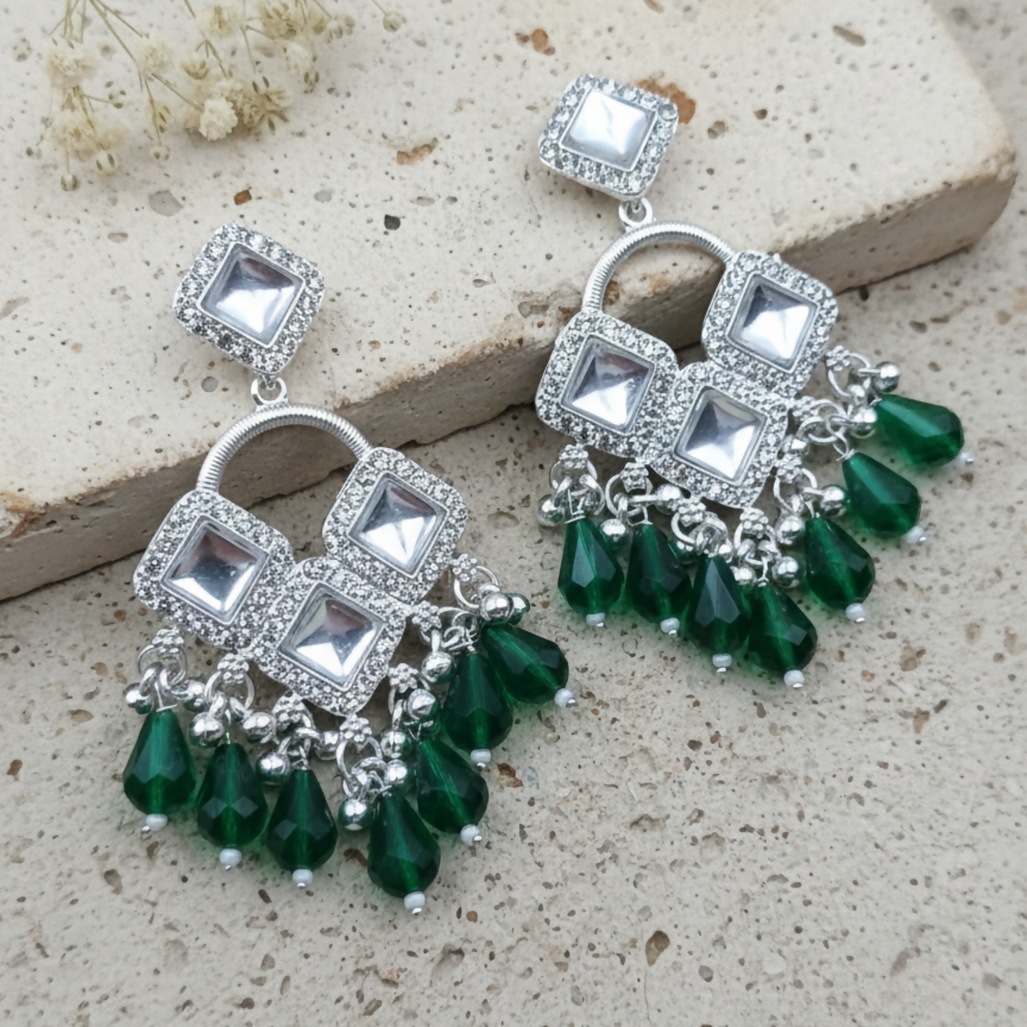 Elegant Silver Plated Chandelier Earrings Featuring Square Crystals and Green Teardrop Beads