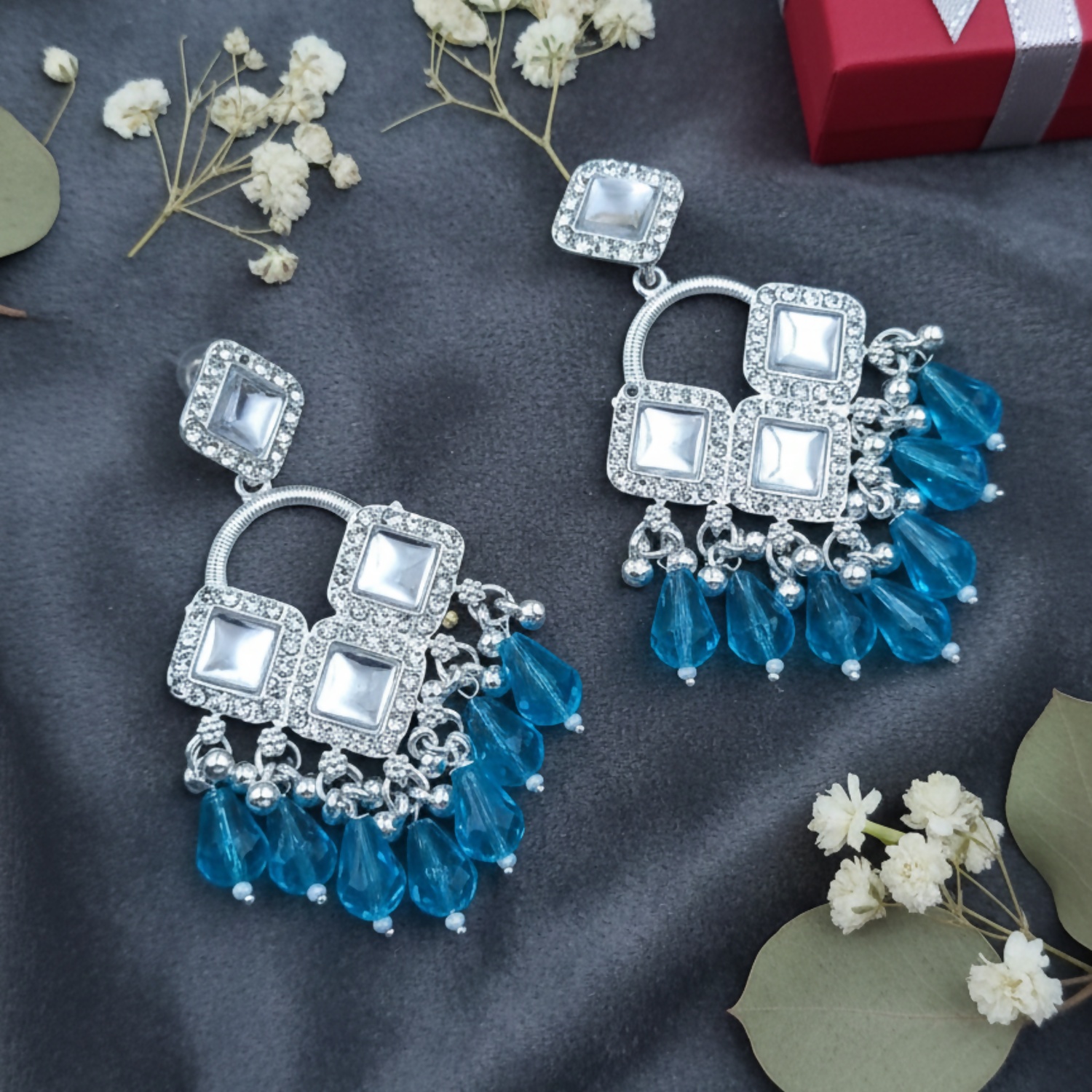 Elegant Silver Plated Chandelier Earrings Featuring Square Crystals and Aqua Blue Teardrop Beads