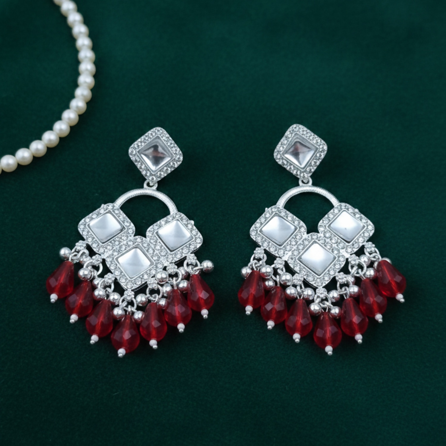 Elegant Silver Plated Chandelier Earrings Featuring Square Crystals and Red Teardrop Beads