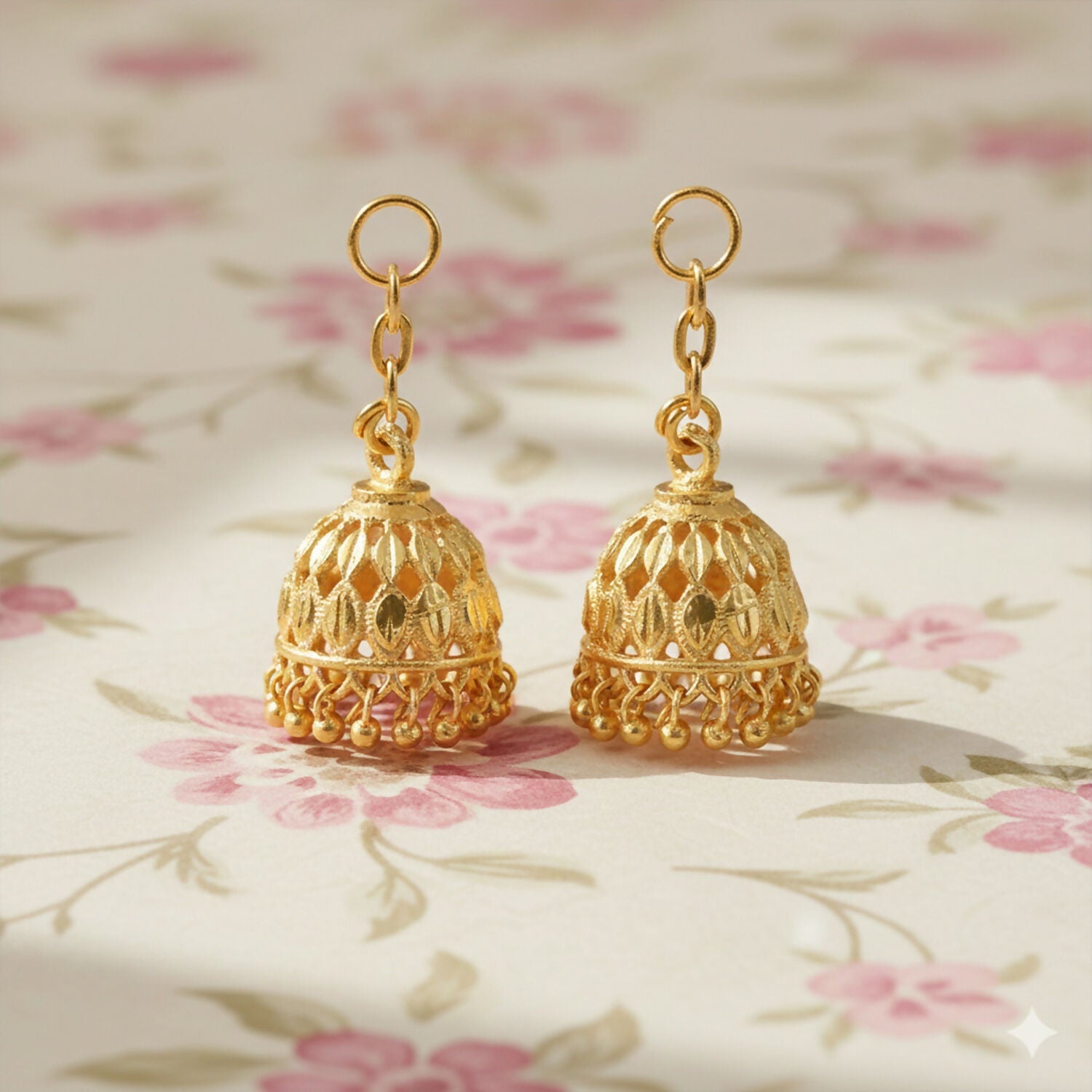 This traditional jhumka features an elegant dome-shaped design with detailed cutwork patterns that showcase classic ethnic craftsmanship. The gold-finish surface gives it a rich and festive look, while the delicate hanging bead accents add graceful movement and charm. Ideal for pairing with traditional and fusion outfits, this jhumka is well-suited for festive occasions, celebrations, and cultural events. Its lightweight feel ensures comfortable wear throughout the day, making it a timeless addition to any jewelry collection.
