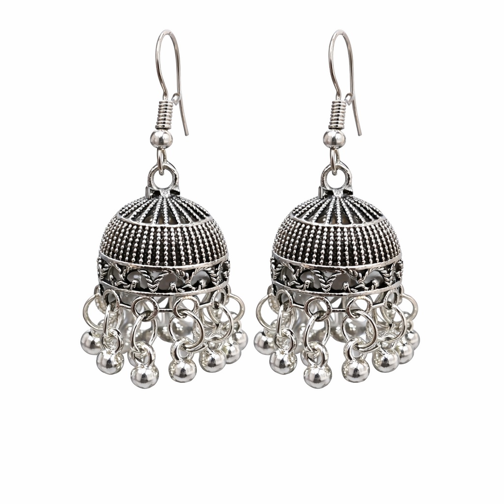 This elegant pair of oxidised silver jhumka earrings showcases intricate traditional detailing with a beautifully textured dome design and dangling ghungroo beads. Finished with a classic oxidised look, these earrings offer a rich ethnic appeal while remaining lightweight and comfortable for daily or long wear. Perfect for festivals, weddings, pooja ceremonies, and casual ethnic styling, this timeless design pairs effortlessly with sarees, kurtis, lehengas, and Indo-western outfits, making it a versatile addition to any jewellery collection.