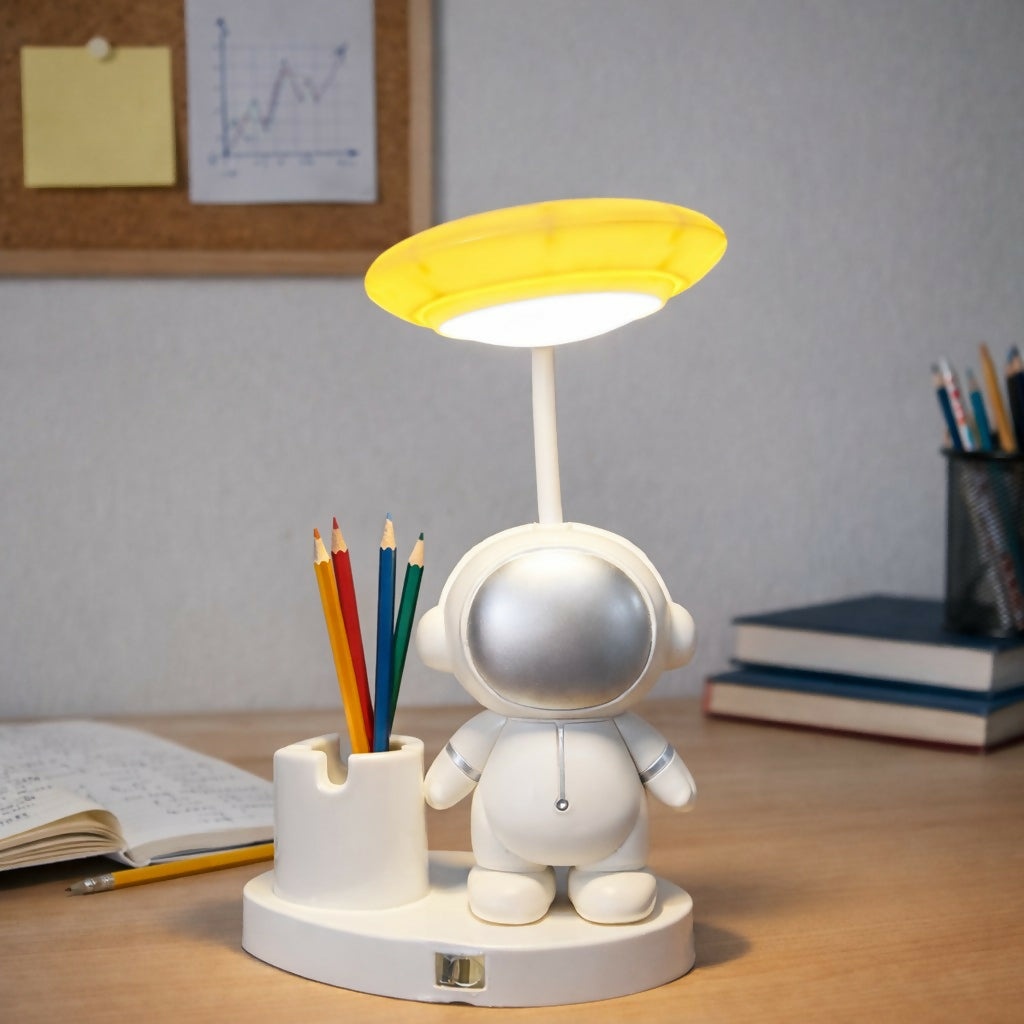 This astronaut-themed LED desk lamp is a perfect blend of creative design and daily utility. Designed with a soft, eye-friendly LED light and a built-in pen holder, it is ideal for study tables, work desks, and bedside use. The flexible lamp neck allows easy adjustment of the light direction, making it suitable for reading, studying, or night lighting. Its compact size and unique astronaut design also make it a great decorative piece and gift option for kids and space lovers.