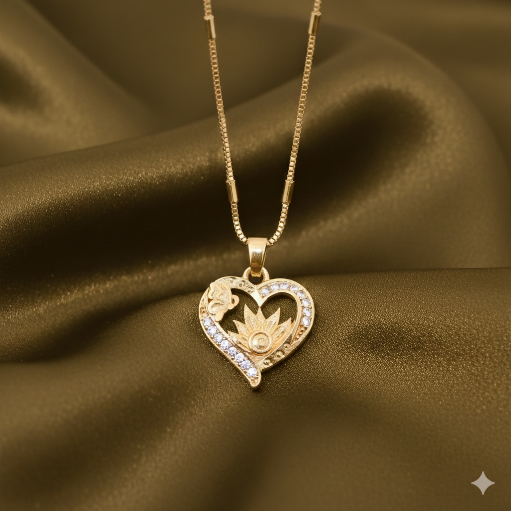 Gold Plated AD Heart Butterfly & Lotus Pendant Necklace For women and girls