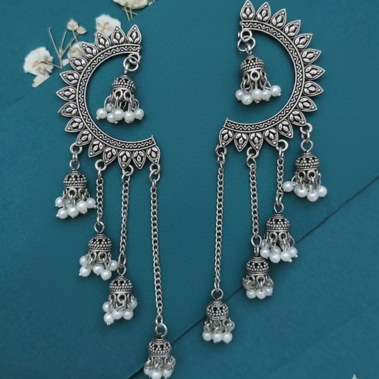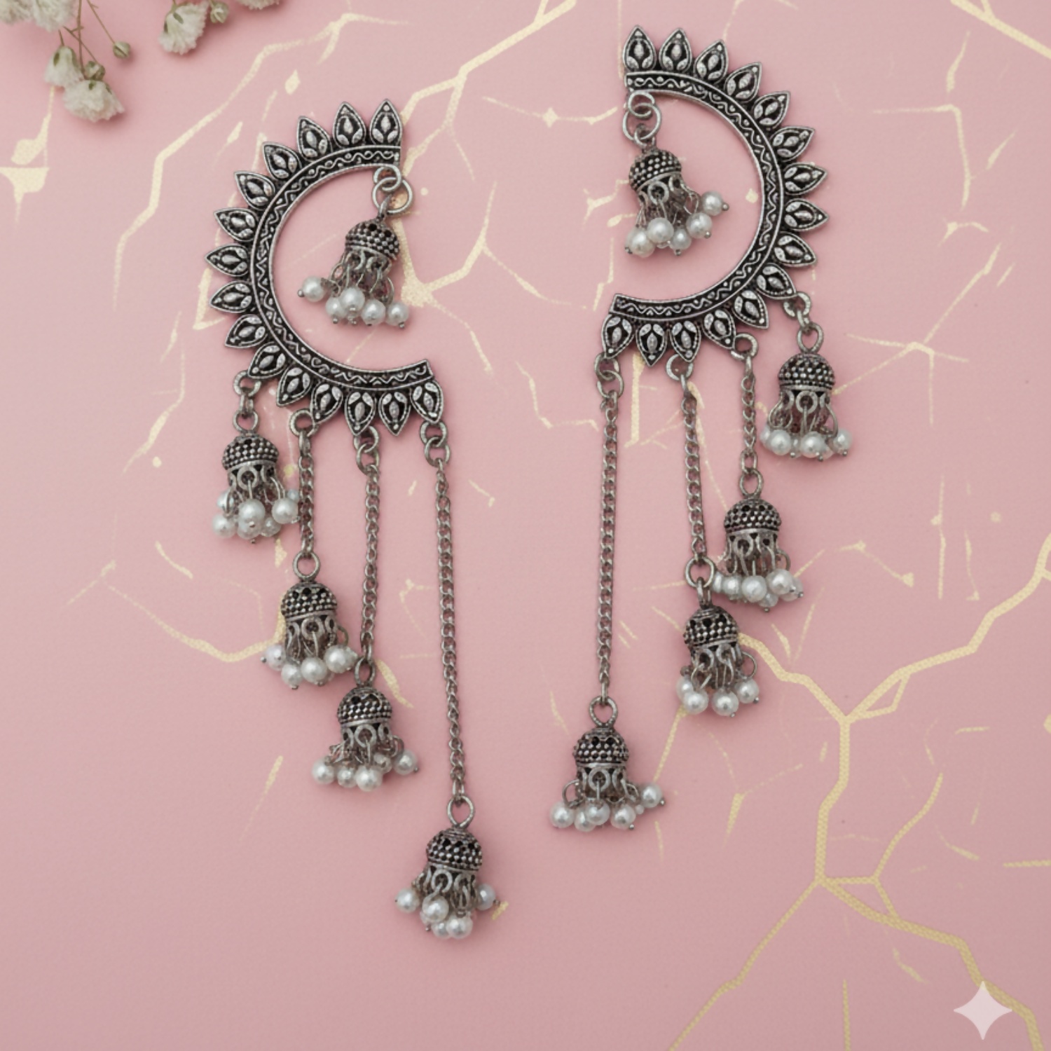 Beautiful oxidized silver crescent-shaped Chandbali earrings featuring intricate traditional detailing. Adorned with delicate pearl jhumka danglers and fine chain drops, these earrings create graceful movement and a regal look. Perfect for weddings, festive occasions, and ethnic wear, they add timeless charm to sarees, lehengas, and anarkalis. Lightweight yet statement-making, ideal for both bridal and traditional styling.