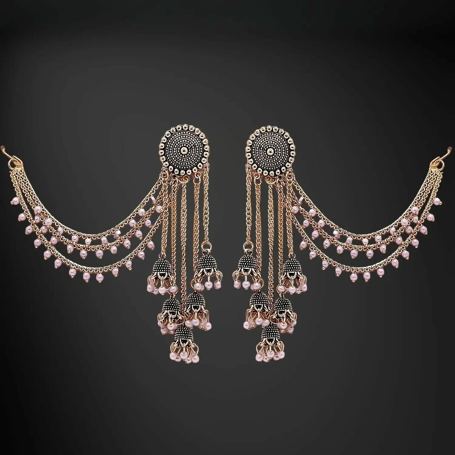raditional Gold-Tone Jhumka Chain Earrings with Pearl Drops. Beautifully crafted with intricate detailing, these earrings feature a classic circular stud design paired with cascading chains and delicate jhumka danglers. Soft pearl beads accent the chains, creating a graceful movement and luxurious finish.
