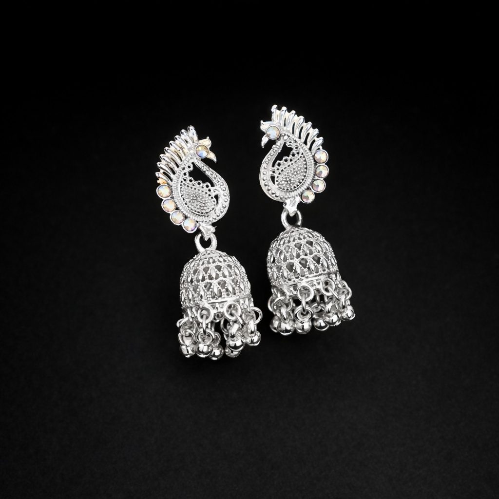 Elegant silver finish jhumka earrings designed with a graceful peacock motif and sparkling stone detailing. The finely crafted dome-shaped jhumka with ghungroo hanging adds a classy traditional touch. Lightweight, comfortable and perfect for festive as well as ethnic wear.