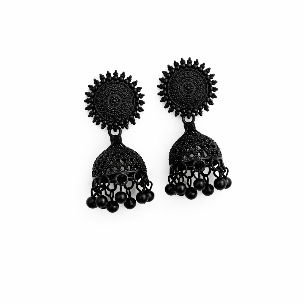 Stylish black oxidised jhumka earrings with intricate circular stud design and elegant hanging beads. Matte black finish gives a bold and classy look, perfect for ethnic as well as fusion outfits. Lightweight, comfortable and easy to carry all day.