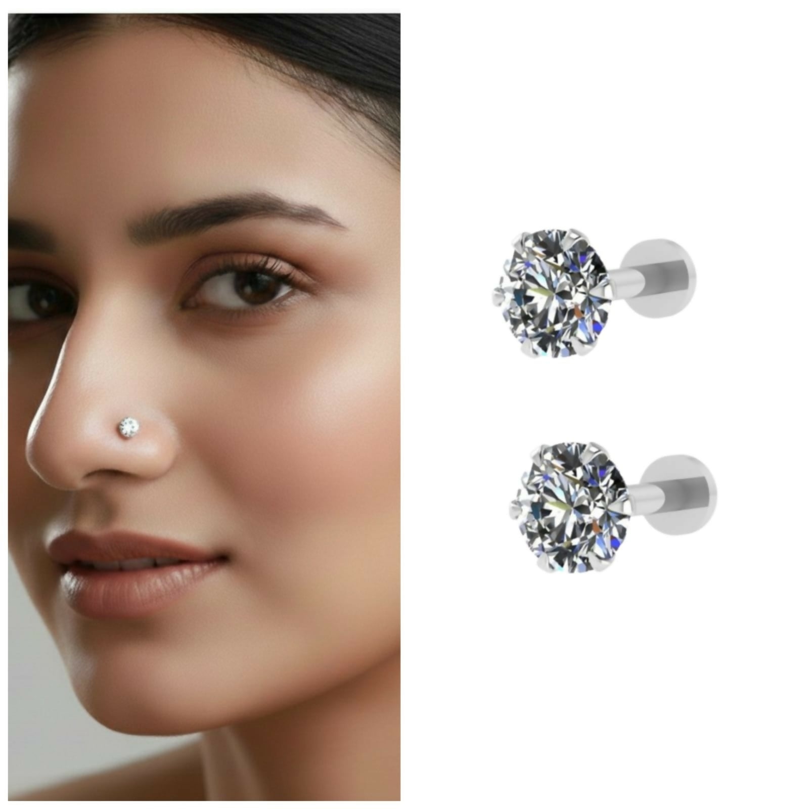 Silver plated AD Nosepin Stud Internally Threaded Labret for women and girls Combo Pack of 2