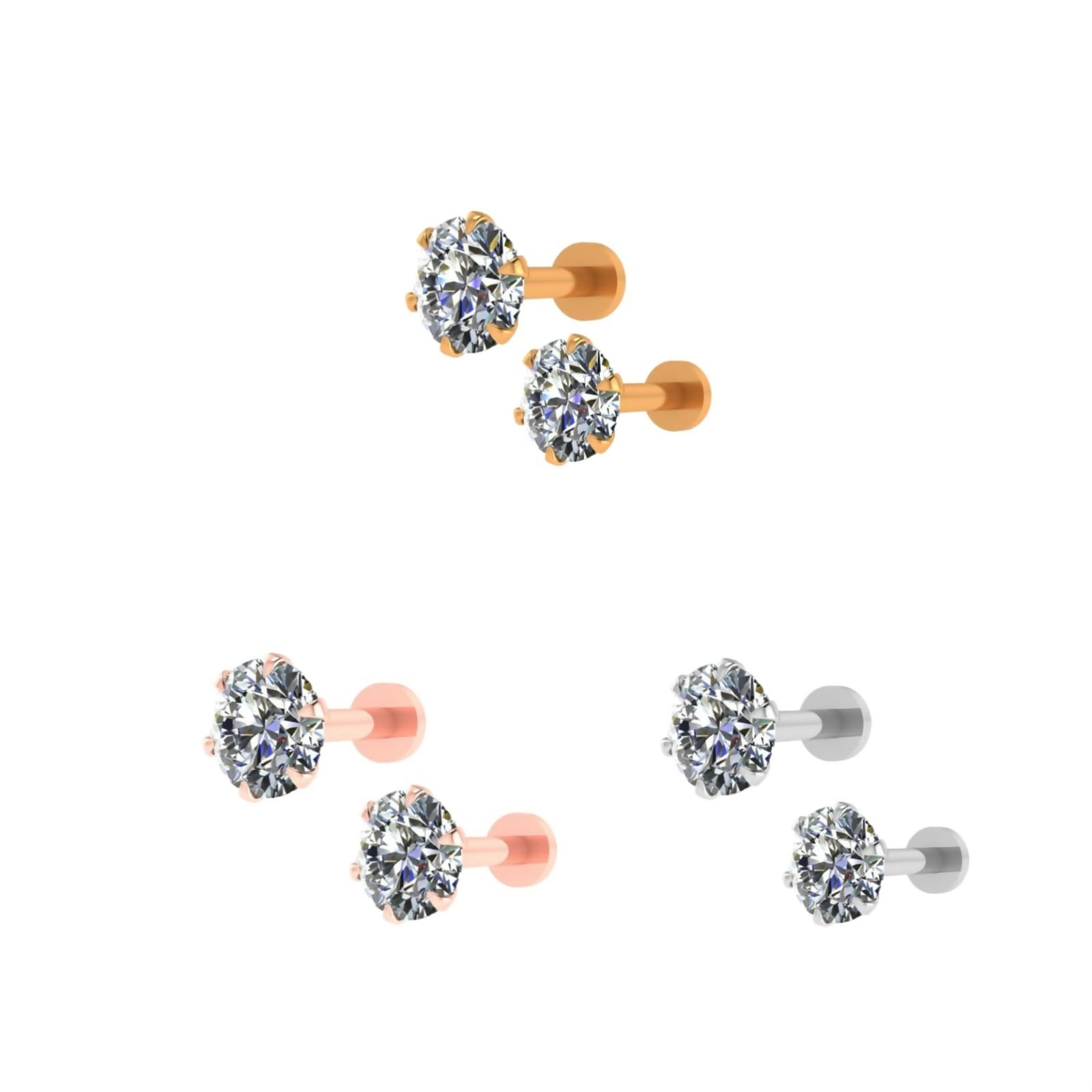 Silver Gold rose Plated Round AD Solitaire Flat Back Stud Earrings Combo Pack of 3