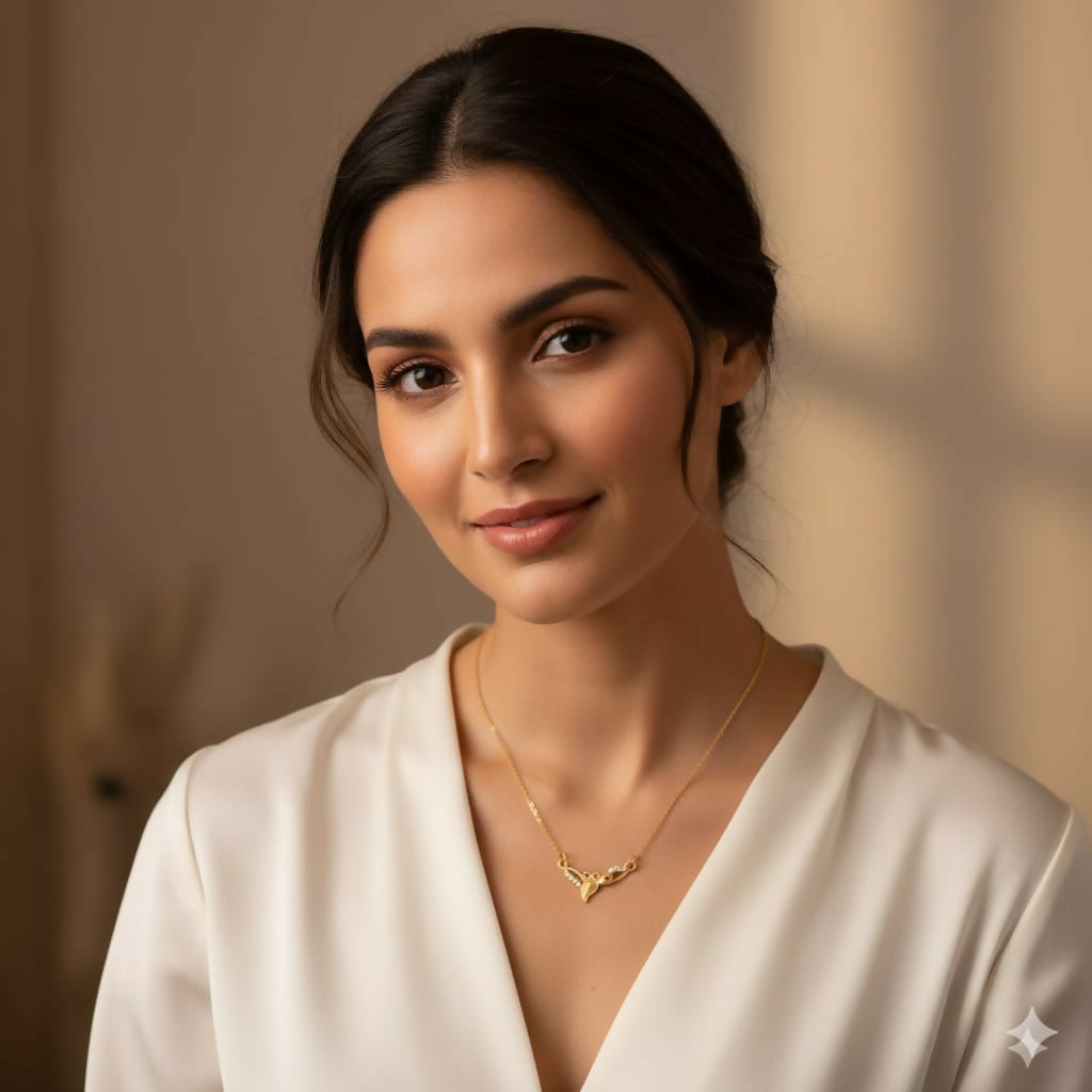 Graceful Design: A curved, nature-inspired pendant that sits perfectly centered.