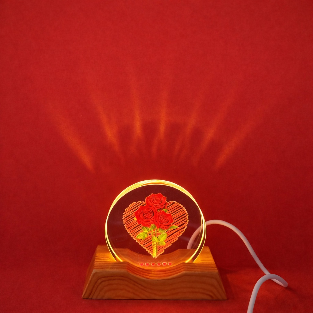 Create a warm and romantic atmosphere with this elegant rose heart acrylic LED lamp. Designed with a beautiful heart-shaped rose artwork engraved on a clear circular acrylic plaque, this lamp sits gracefully on a premium wooden base. When illuminated, it emits a soft, soothing glow that enhances bedrooms, living spaces, and cozy corners. A perfect gift to express love and emotions on anniversaries, Valentine’s Day, birthdays, or special occasions.