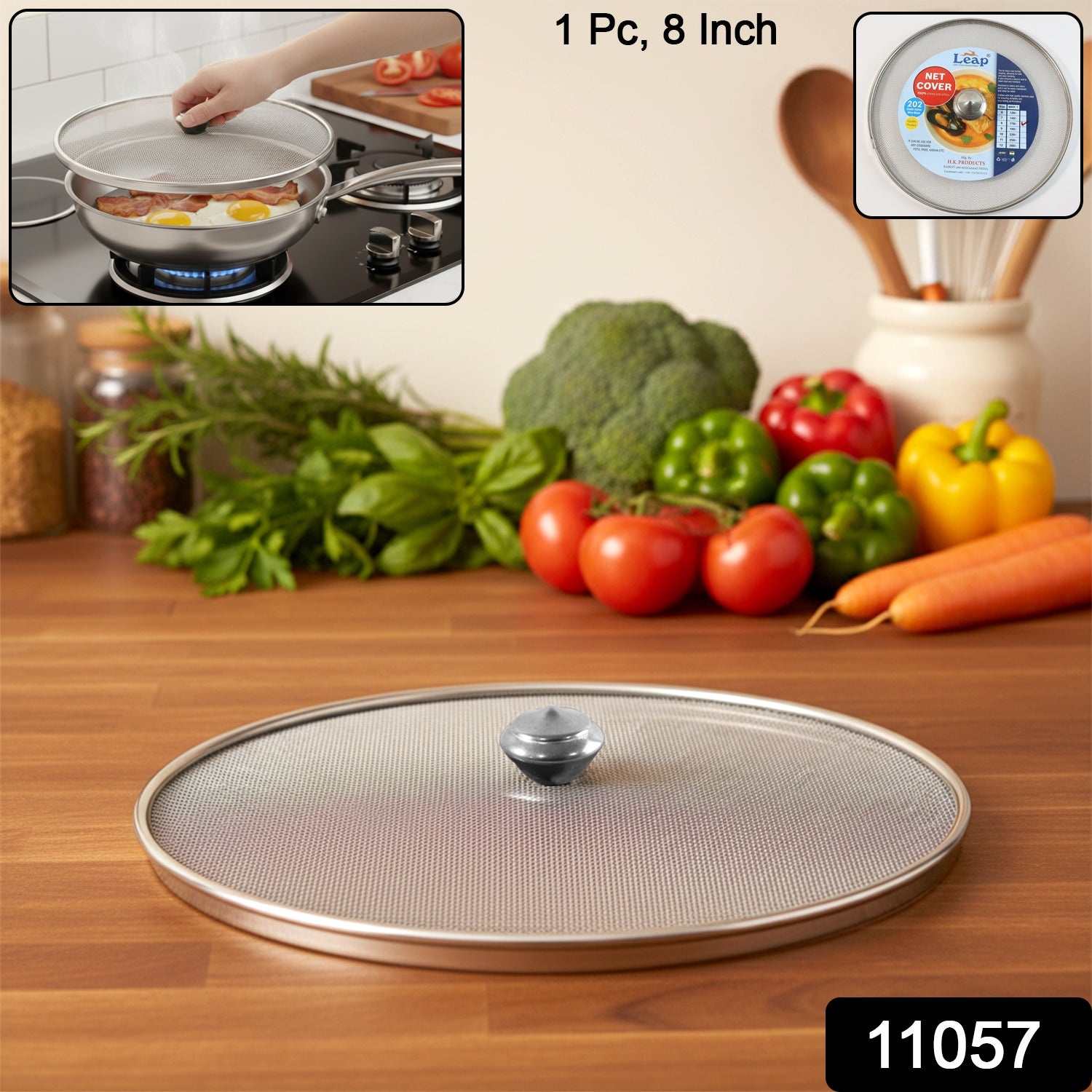 This stainless steel food net cover is a practical kitchen essential designed to protect food while cooking and serving. Made with a fine metal mesh, it allows steam to escape while preventing oil splashes, insects, and dust from coming into contact with food. The sturdy circular frame ensures a secure fit over frying pans, kadhai, plates, and bowls, while the central heat-resistant knob handle makes lifting and placing easy. Ideal for everyday Indian cooking, this net cover helps maintain cleanliness and safety in the kitchen without affecting cooking performance.