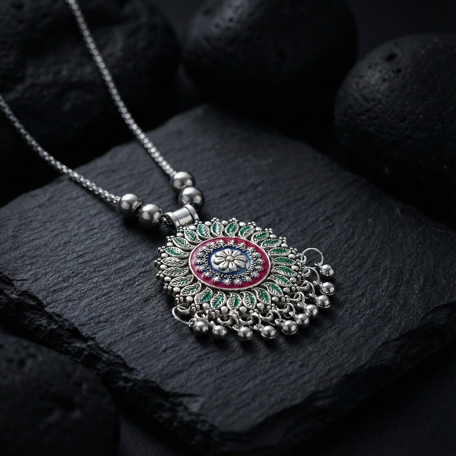 This beautifully crafted antique silver-tone oxidized pendant necklace showcases a detailed floral mandala design highlighted with vibrant enamel accents and intricate metalwork. The circular pendant is adorned with delicate hanging ghungroo-style beads that add movement and traditional charm. Paired with a sturdy beaded chain, this necklace blends classic ethnic aesthetics with a contemporary statement appeal. Ideal for enhancing traditional outfits and fusion wear, it brings an artistic and handcrafted touch to festive and cultural looks. A timeless imitation jewellery piece designed to elevate your ethnic jewellery collection.