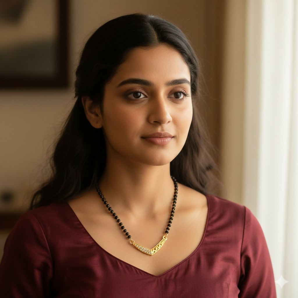 Suspended from a classic strand of high-quality black beads, this Mangalsutra is lightweight, versatile, and perfect for both office wear and casual outings.