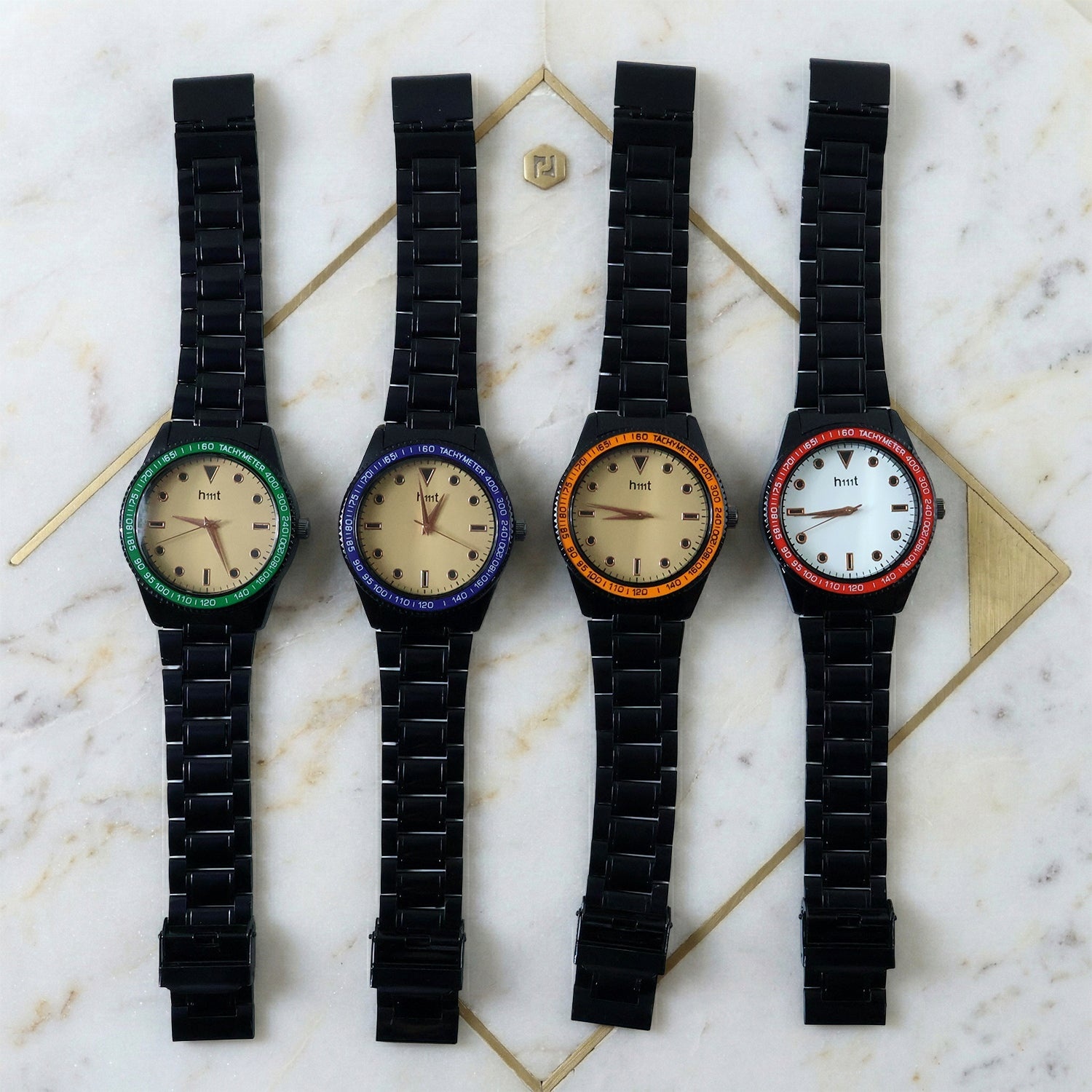 Classic Analog Wrist Watch with Black Dial, Tachymeter Bezel and Black Metal Strap (Mix Colour, 1 Pc)