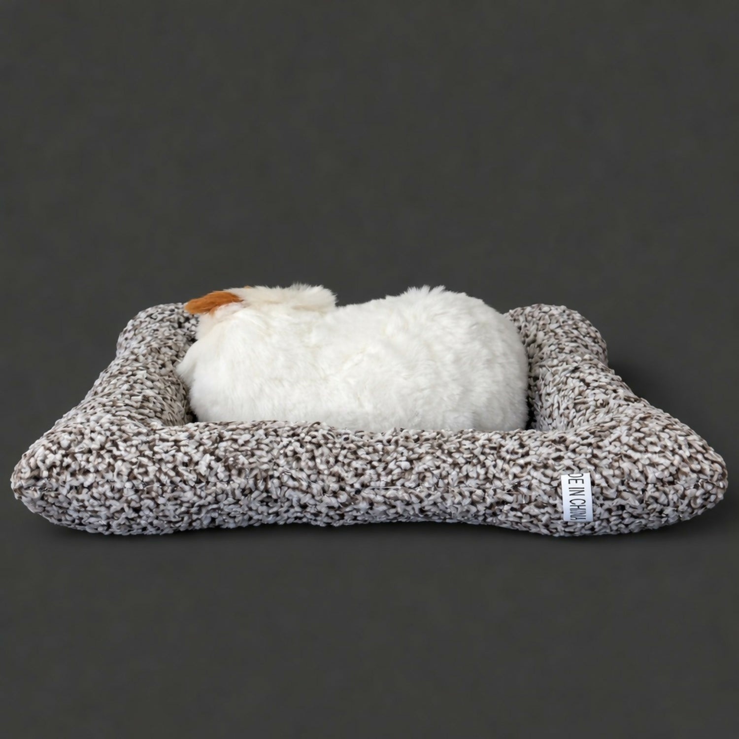 • Cute sleeping cat figurine placed on a soft textured cushion