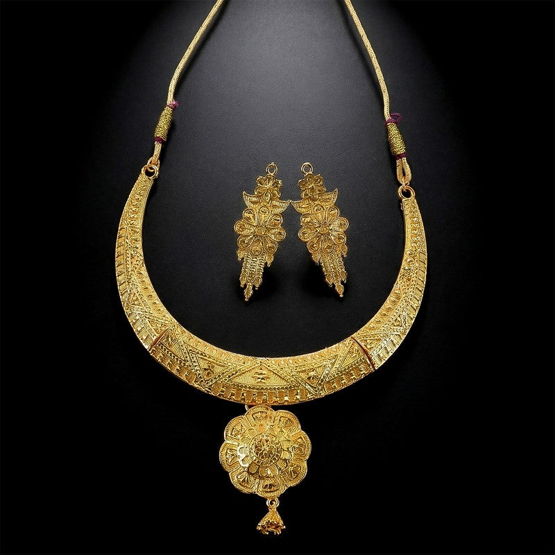 This striking crescent-shaped necklace set showcases a beautifully engraved design that blends tradition with contemporary elegance. The bold centerpiece is complemented by a matching floral pendant and intricately crafted earrings, creating a refined ethnic look. Perfect for weddings, festive occasions, and cultural gatherings, its radiant gold finish adds a luxurious touch to sarees, lehengas, and classic attire. A standout accessory for those seeking sophisticated craftsmanship and a unique traditional silhouette.