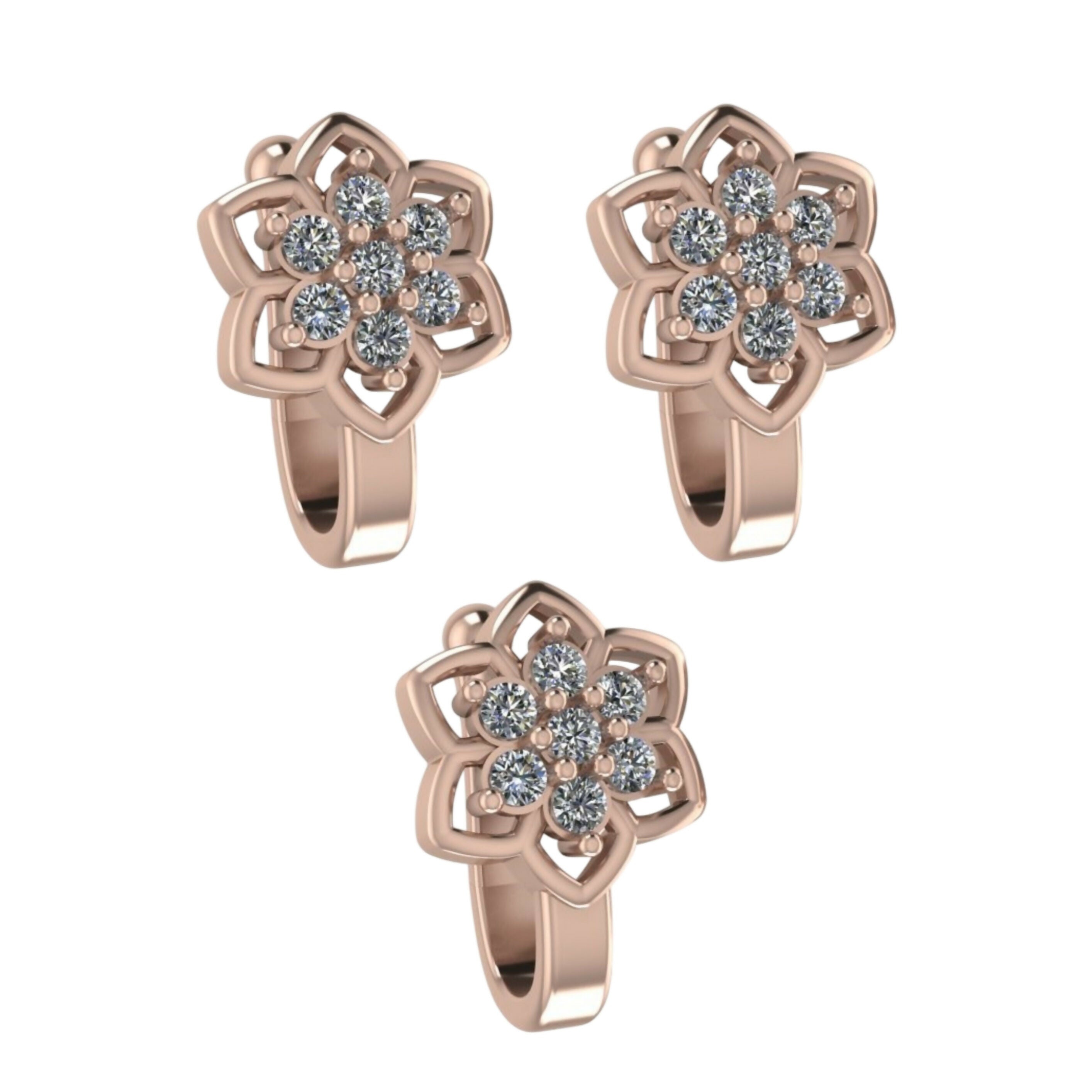 Instantly enhance your festive or ethnic look with this gorgeous set of three rose gold-plated non-piercing nose clips. Each clip features an intricate six-petal flower cluster design, meticulously studded with sparkling cubic zirconia (CZ) stones for a luxurious, diamond-like appeal.