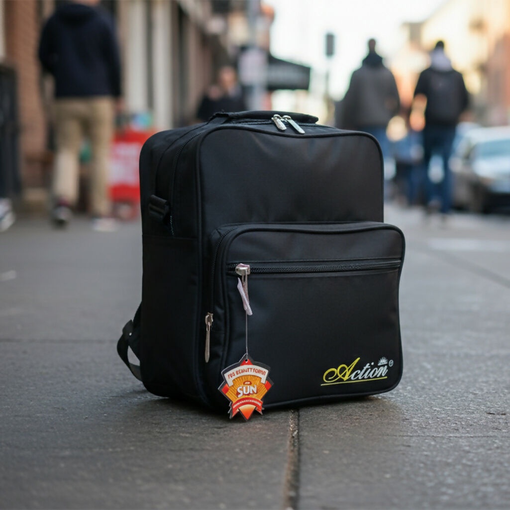 Modern & Stylish Look: Sleek black design with the Action logo, suitable for office, school, college, and travel.