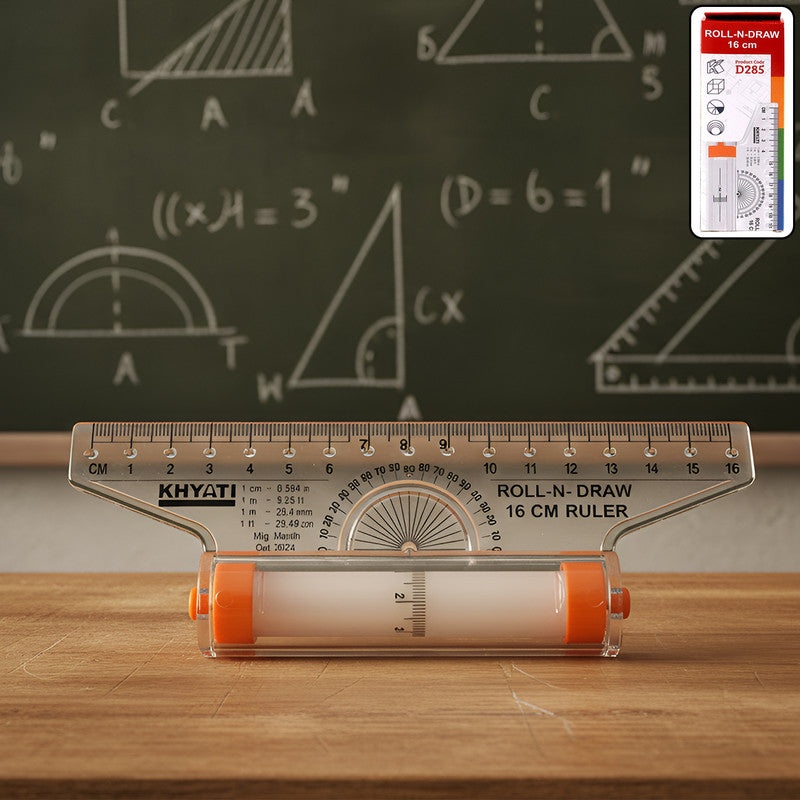 The Roll-N-Draw 16 cm precision ruler is a smart and versatile drawing tool designed for smooth, accurate, and effortless work, featuring a built-in rolling mechanism that allows the ruler to glide easily across the surface for creating perfect circles, arcs, and continuous curved lines without slipping; its transparent body ensures clear visibility of measurements and drawings for enhanced accuracy, making it ideal for students, designers, engineers, architects, and classroom use, while its compact, easy-to-handle design supports both technical drafting and everyday geometry and drawing tasks with consistency and control.