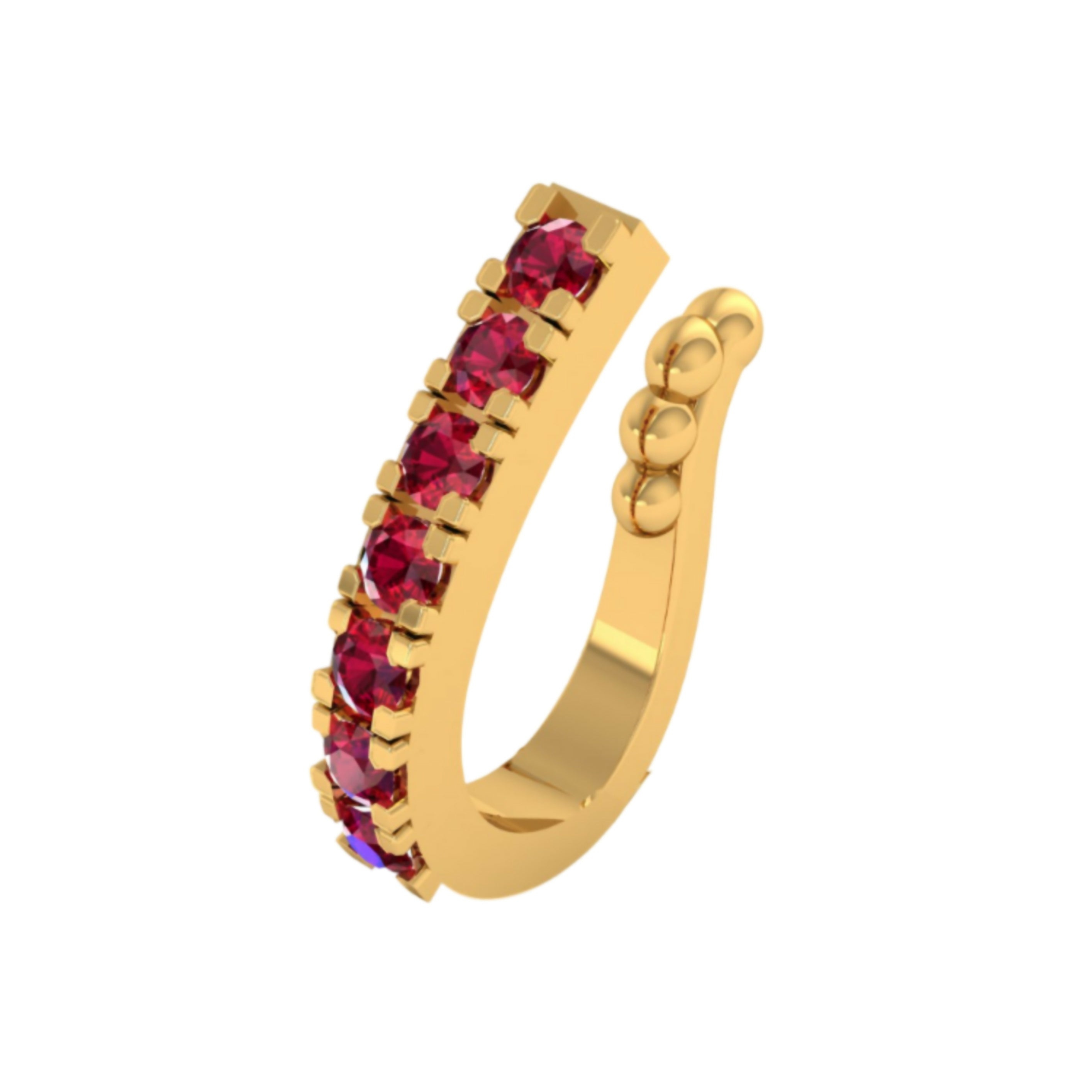 Celebrate traditional elegance with a modern twist! This stunning non-piercing nose clip (also known as a clip-on nath) features a row of vibrant ruby/pink-colored stones set in a polished gold-toned plating.