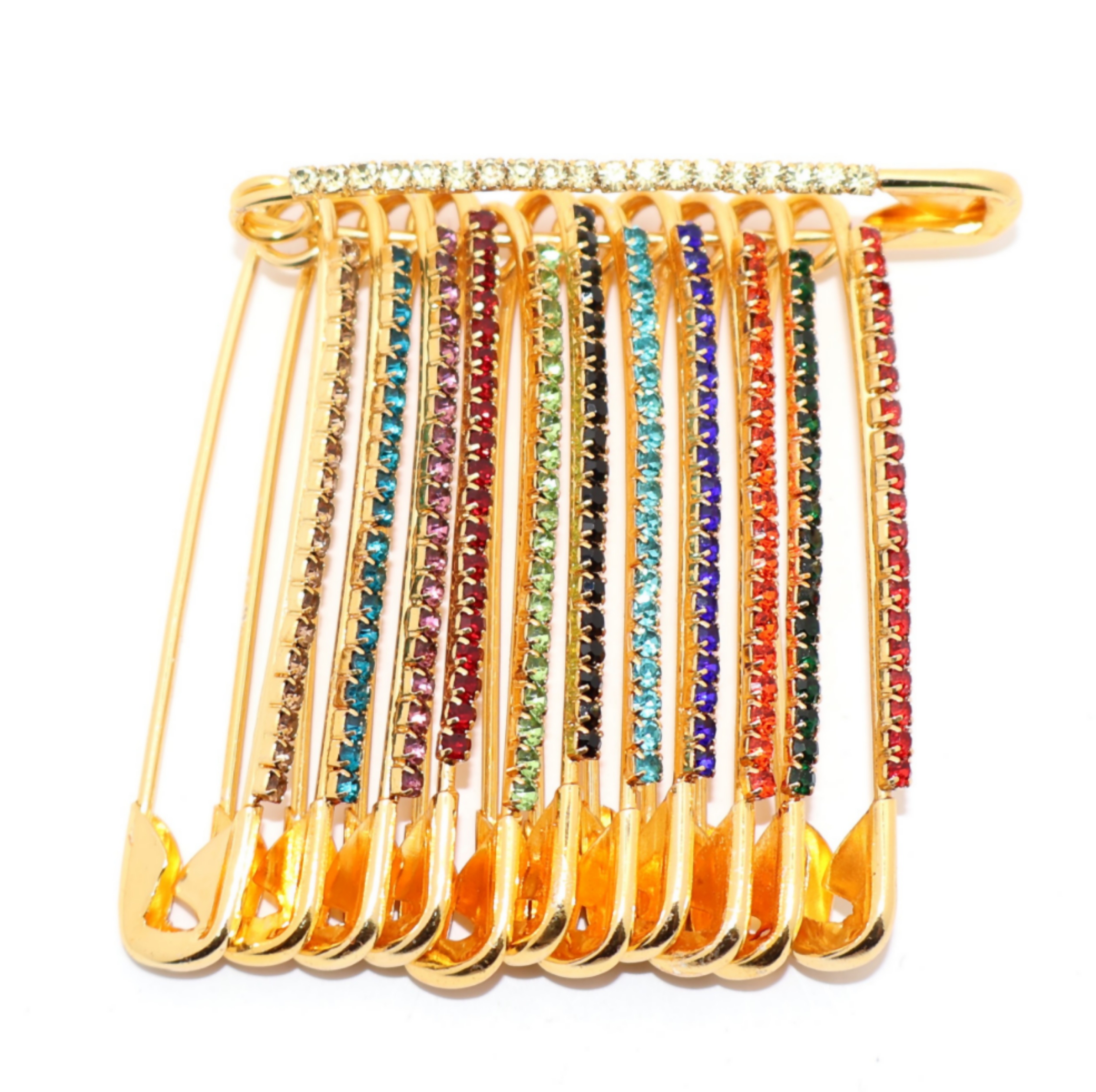 Elevate your accessory collection with this stunning Rose Gold-Tone Safety Pin Brooch. This piece features a trendy, warm rose gold finish that perfectly complements the cascading fan design of multiple safety pins. Each pin is meticulously paved with brilliant clear crystals and rhinestones for an exquisite diamond-effect sparkle. The large, faceted crystals at the base of the fan beautifully catch the light.