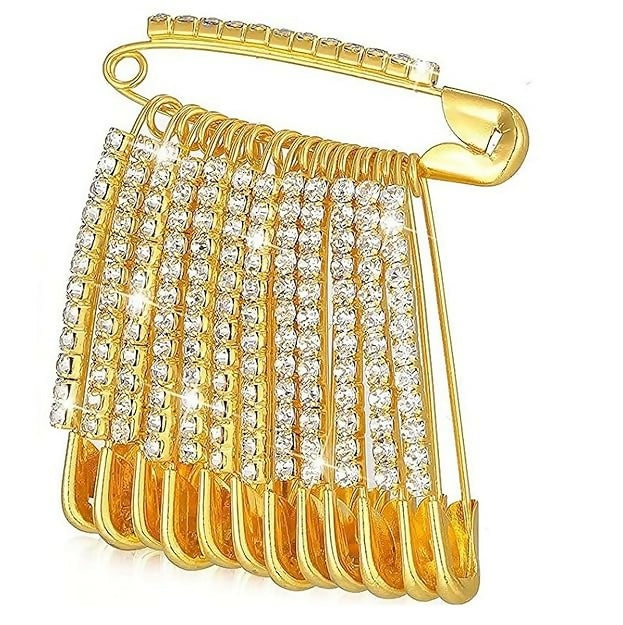 Add a touch of glamour and modern edge to any outfit with this stunning gold-tone safety pin brooch. This unique piece features a large, secure safety pin base, decorated with a row of sparkling, high-quality rhinestone crystals.