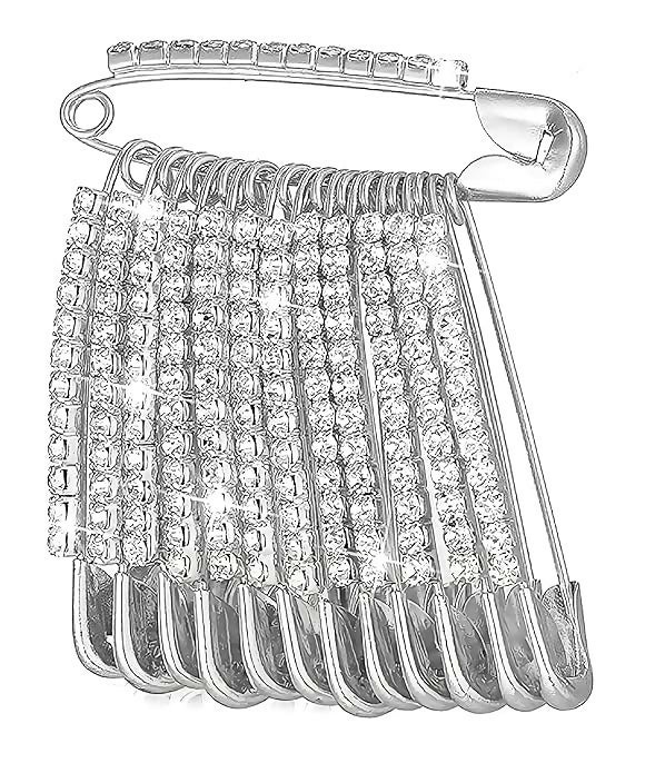 The main brooch is adorned with 12Â smaller, functional safety pins that dangle gracefully. Each of these mini pins is completely paved with rows of sparkling, clear crystals, creating a luxurious, high-shine effect and captivating movement.