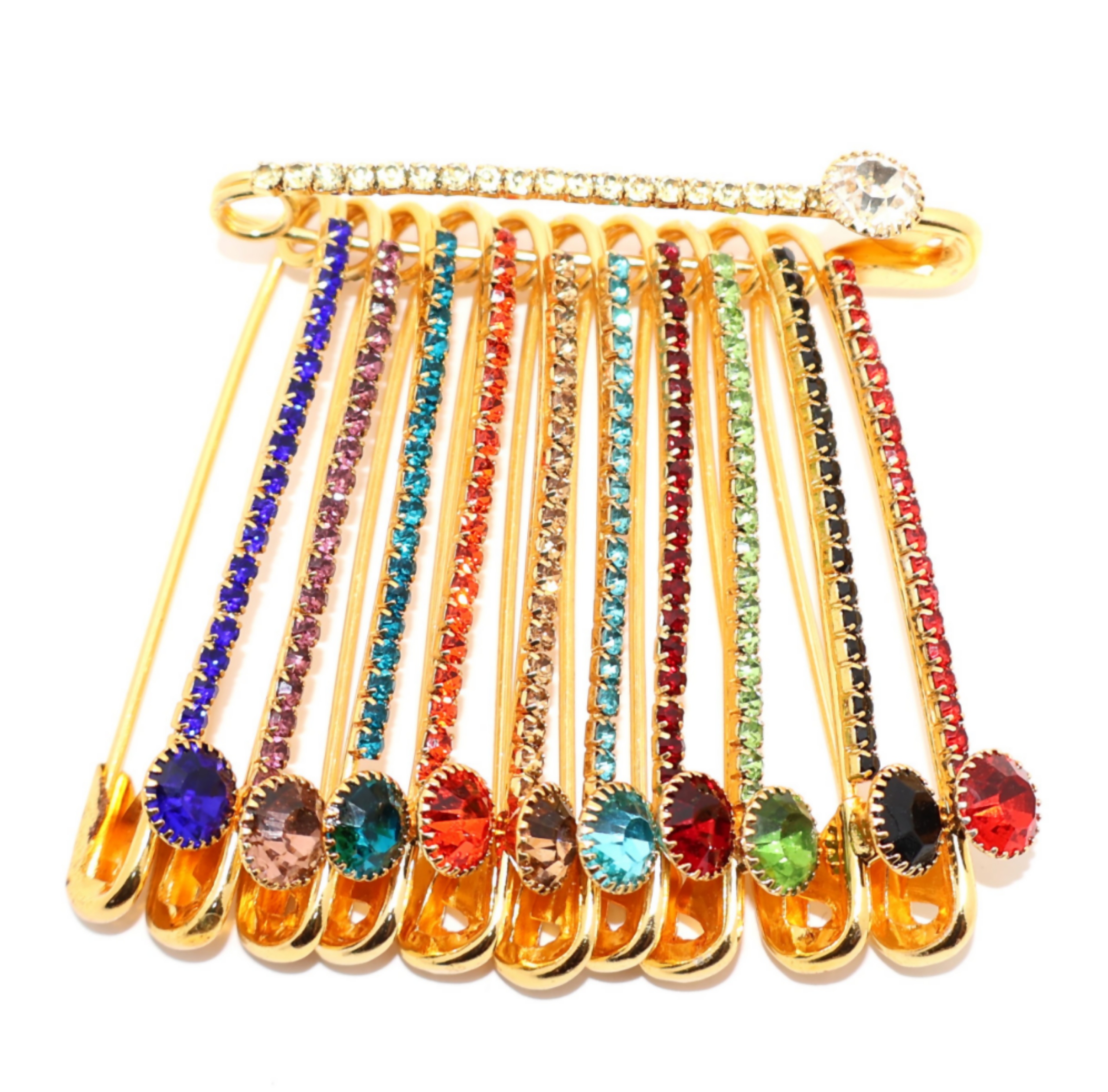Add a vibrant pop of color to your wardrobe with this eye-catching Rainbow Crystal Safety Pin Brooch. This striking accessory features a luxurious gold-tone setting with a cascading fan of decorative safety pins, each adorned with a row of brilliant, multi-colored rhinestones. The large focal crystals at the base of each pin showcase colors like deep sapphire, ruby red, emerald green, and sunny citrine.