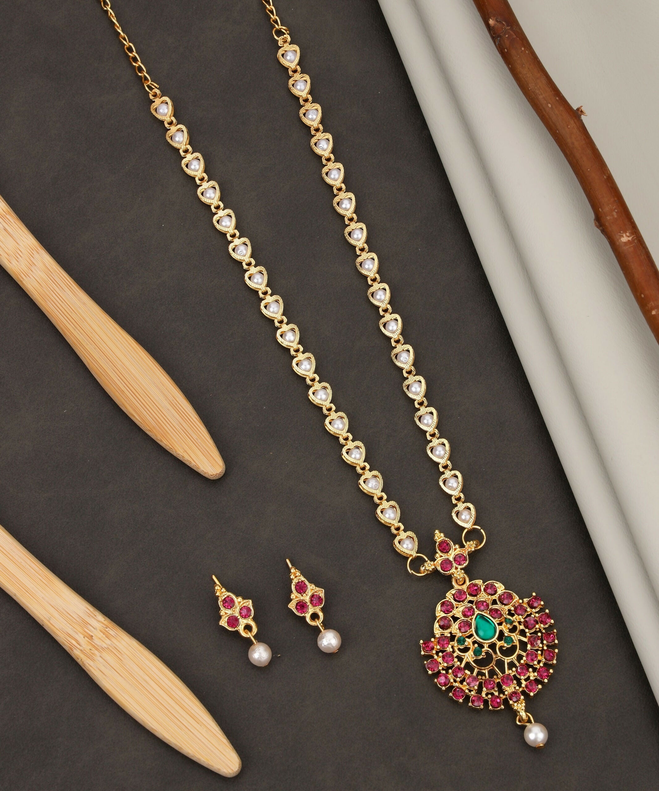 A delicate gold-tone choker featuring interconnected floral links, each centered with a Green-Pink stone and surrounded by white crystals. The links are finished with small faux pearl drops. Includes matching floral stud earrings.