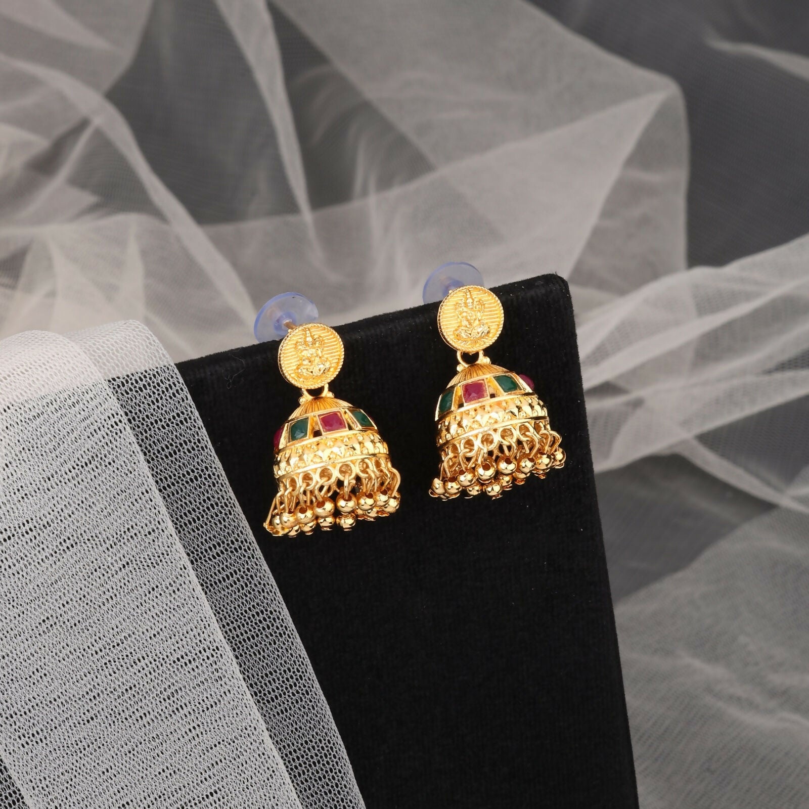 A vibrant gold-plated necklace featuring connected shield motifs with a textured green stone/enamel finish. The links are accented with small ruby-red stones, and the necklace features a prominent circular pendant. Includes matching earrings (not shown in the necklace image, but inferred from the style).