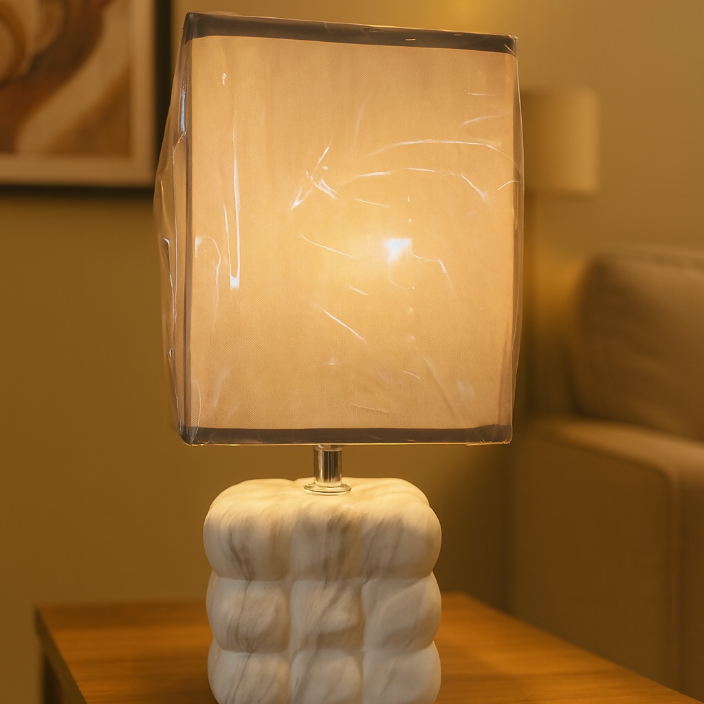 The crisp square fabric lampshade emits a warm, diffused glow, creating a cozy and calming atmosphere ideal for bedrooms, living rooms, study tables, reading corners, or office spaces. The lampshade is shown with its protective plastic wrap (which can be removed before use), ensuring it stays clean and pristine.