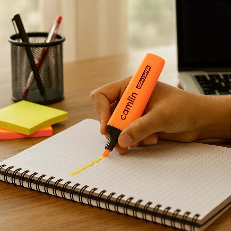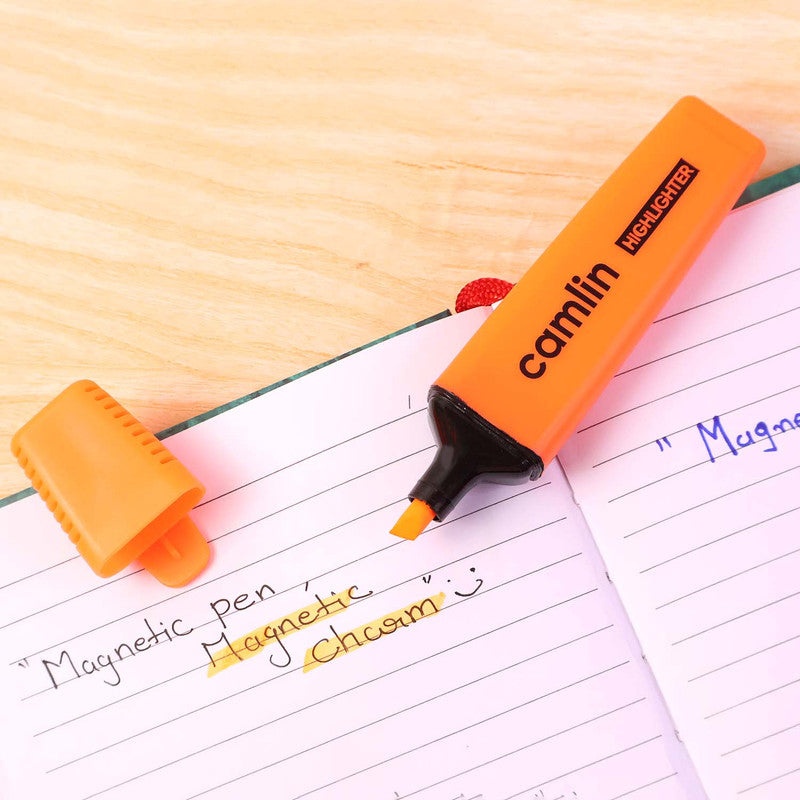 This Camlin Orange Highlighter offers a bright and clear fluorescent shade that makes key text stand out instantly while reading or reviewing notes. Its chisel tip allows both fine and broad strokes, ensuring smooth, consistent highlighting without smudging on paper, copies or printed documents. The comfortable barrel design supports long hours of study or office work, delivering reliable colour flow and neat results. This pack includes 10 orange-coloured highlighters, making it an ideal choice for schools, offices and regular stationery needs.