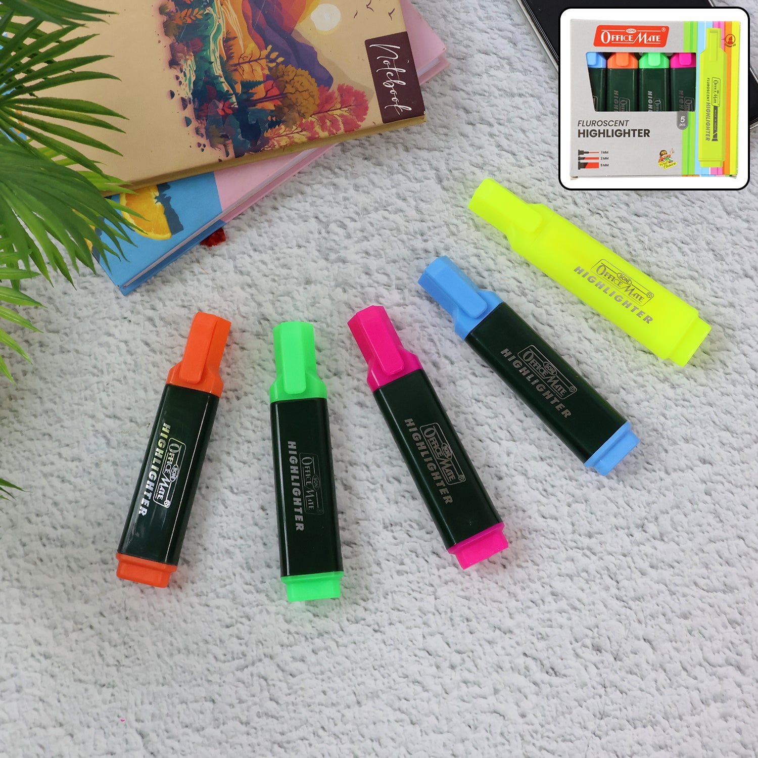 Brighten your notes and documents with the OfficeMate Fluorescent Highlighter Set of 5, featuring vivid shades of yellow, orange, green, blue, and pink. Each highlighter is equipped with a durable chisel tip that allows both fine and broad highlighting for versatile use. The water-based ink resists fading and glides smoothly on paper, making it ideal for studying, office work, or creative projects. Designed for long-lasting performance, these highlighters provide clear, precise marks without smudging. Perfect for students, teachers, and professionals who value quality and style in every stroke.