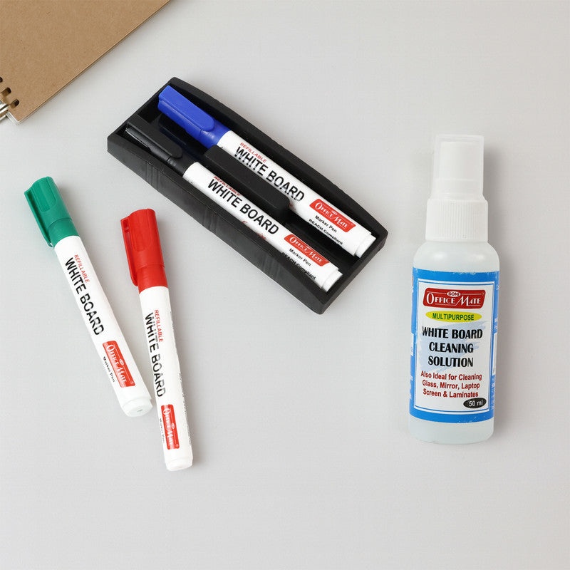 This whiteboard starter kit is the perfect all-in-one solution for classrooms, offices, and home learning spaces. The set includes four refillable markers in vibrant colors — red, blue, green, and black — for clear and bold writing. A high-quality duster ensures quick and clean erasing without leaving residue, while the 50ml cleaning solution keeps your board spotless and shining after every use. The markers deliver smooth ink flow with a quick-drying formula to prevent smudging, making your writing sharp and visible. Ideal for teachers, professionals, and students, this kit offers everything you need for an efficient and organized writing experience.