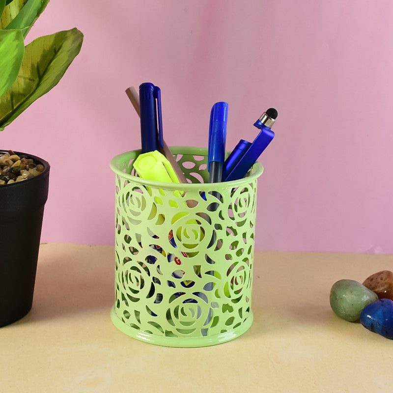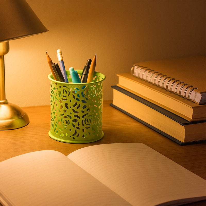 The Khyati Roseira Pen Stand combines elegance with functionality, featuring a delicate floral cutwork design crafted from durable metal. Its open structure adds a decorative touch while keeping your desk essentials like pens, pencils, markers, and scissors neatly organized. The rust-resistant coating ensures long-lasting shine and durability, making it a perfect addition to both modern and traditional workspaces. Compact yet stylish, it enhances the beauty of any office desk, study table, or home workspace.