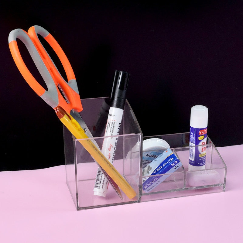 The Khyati Elite Transparent Acrylic Desk Organizer brings a modern and minimalist touch to any workspace. Crafted from high-quality clear acrylic, it offers three spacious compartments to neatly hold pens, scissors, glue sticks, markers, and other small office supplies. Its sturdy, transparent design not only makes it durable but also visually elegant, allowing easy visibility of contents. Perfect for maintaining a tidy and stylish desk, this organizer fits effortlessly into home offices, classrooms, or professional workspaces.