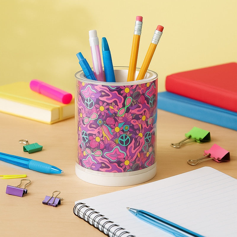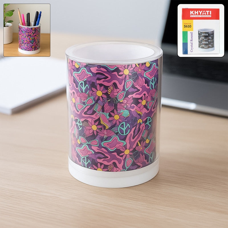 The Khyati Crystal Round Pen Stand combines modern style with everyday functionality, making it a perfect addition to any workspace. Its clear cylindrical body features an attractive printed inner design that adds a pop of color and character to your desk. This pen stand provides ample space for storing pens, pencils, markers, and small tools, helping keep your workspace clutter-free. Its sturdy construction and smooth finish ensure durability while offering a sleek, contemporary look ideal for both office and home use.