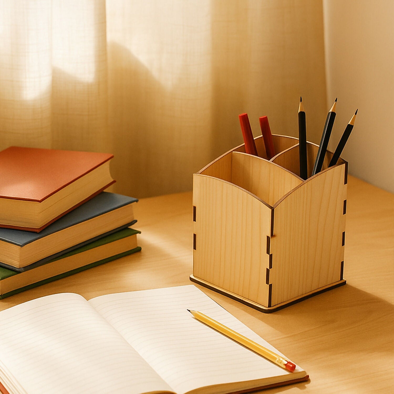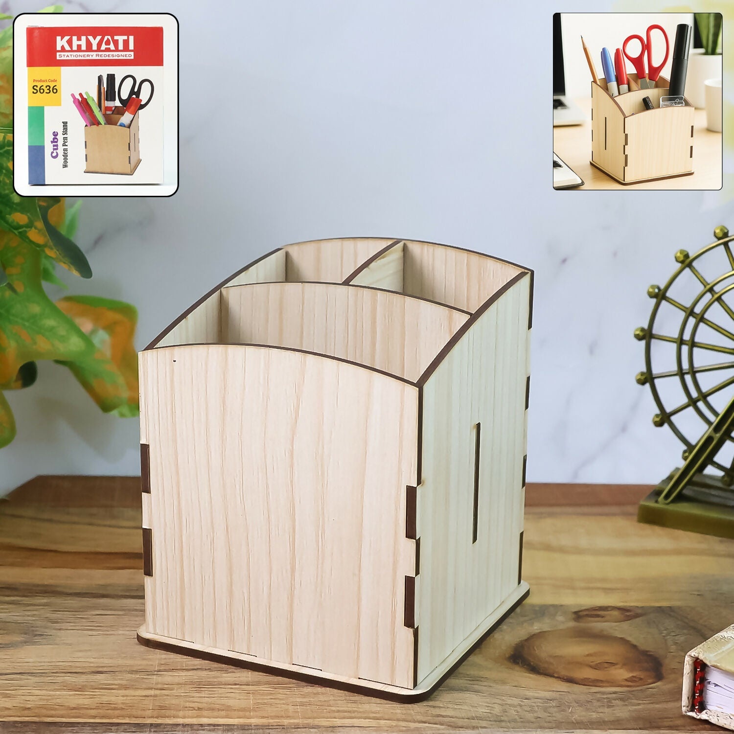 The Khyati Wooden Pen Stand (Cube Model) brings a natural touch of elegance and organization to any workspace. Crafted with a smooth wood-finish design, this sturdy desk organizer features multiple compartments to neatly hold pens, markers, scissors, and office accessories. Its durable structure and classic aesthetic make it a perfect fit for both modern and traditional desks. Designed for everyday convenience, it helps you keep your workspace clutter-free while adding a warm, professional look to your desk décor.