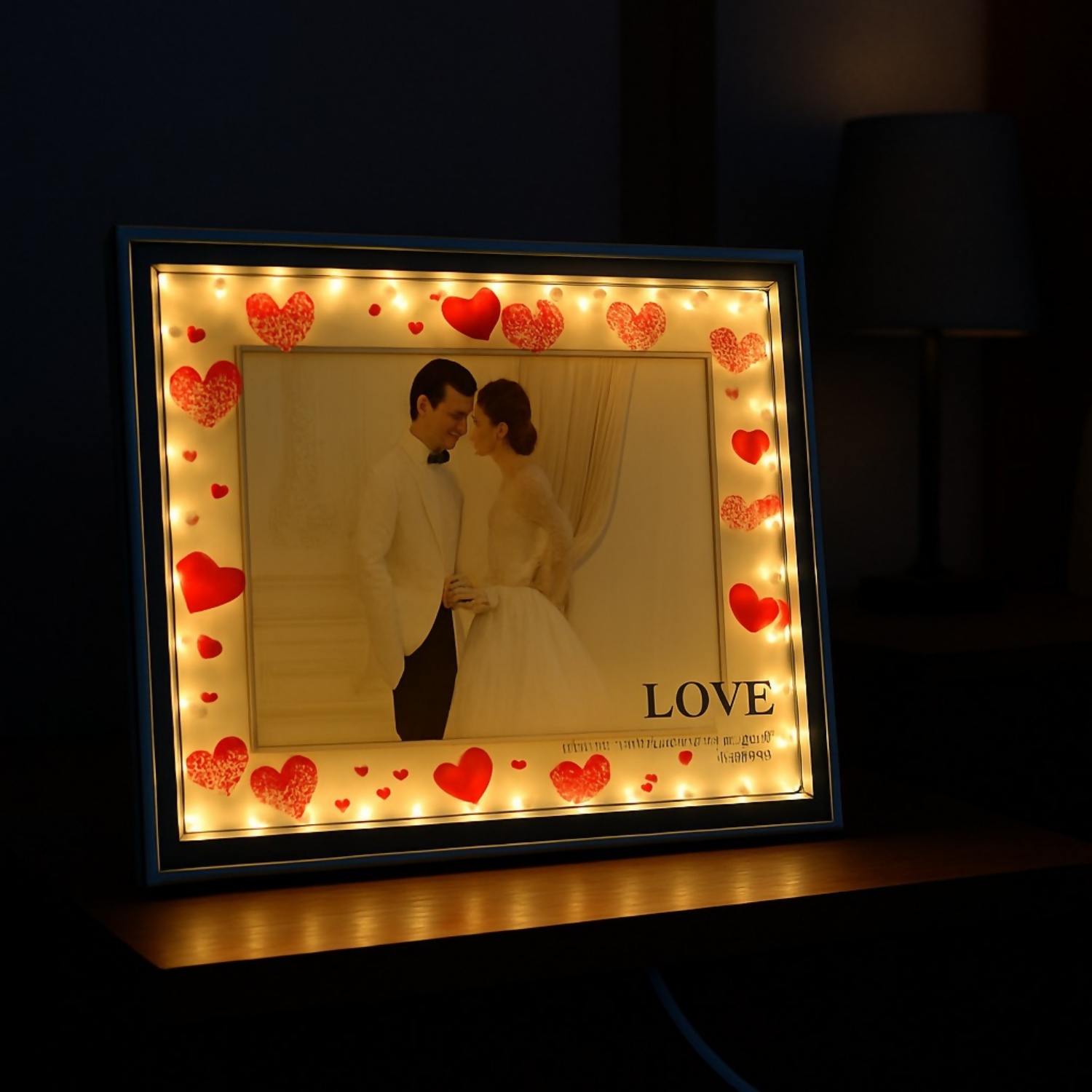 LED photo frame, heart design photo frame, couple gift photo lamp, romantic photo frame light, illuminated 5x7 photo frame, warm light picture frame, anniversary gift for couple, wedding decorative frame, love theme LED frame, USB powered photo lamp, glowing picture frame, bedroom décor light, tabletop LED frame, Valentine couple gift, romantic home décor item