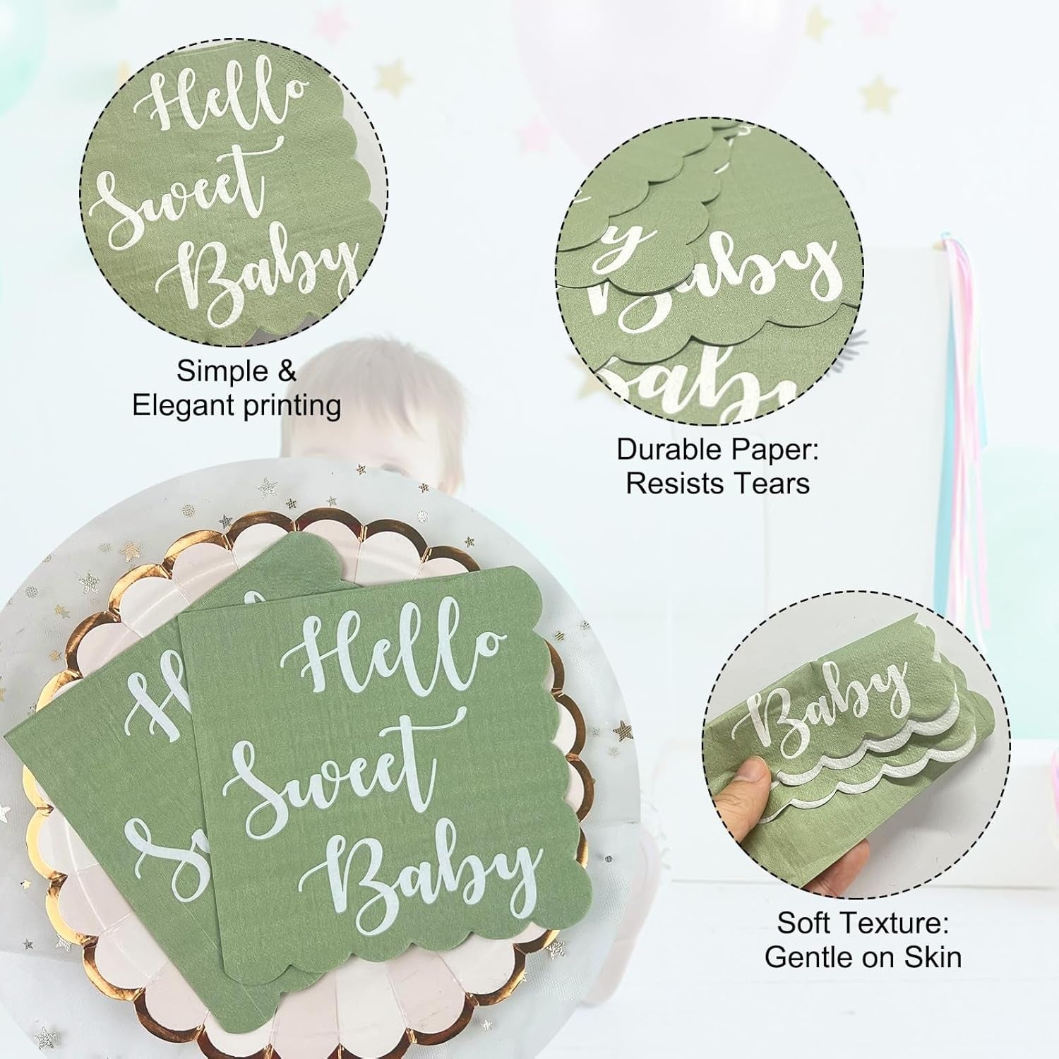 • Charming Design: Features a delicate mint green color with “Hello Sweet Baby” text and scalloped edging for an elegant look.