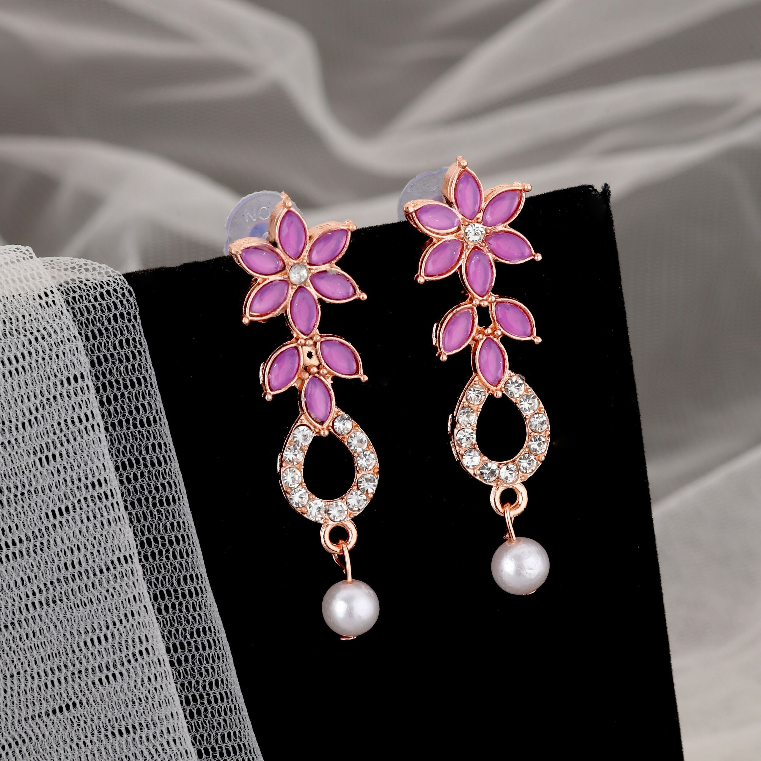 Elevate your look with this enchanting necklace and earring set, finished in a trendy rose gold plating. The design contrasts dazzling white crystals with vivid fuchsia/magenta stones in a delicate, modern floral pattern, making it a perfect statement piece for parties, receptions, or festive occasions.