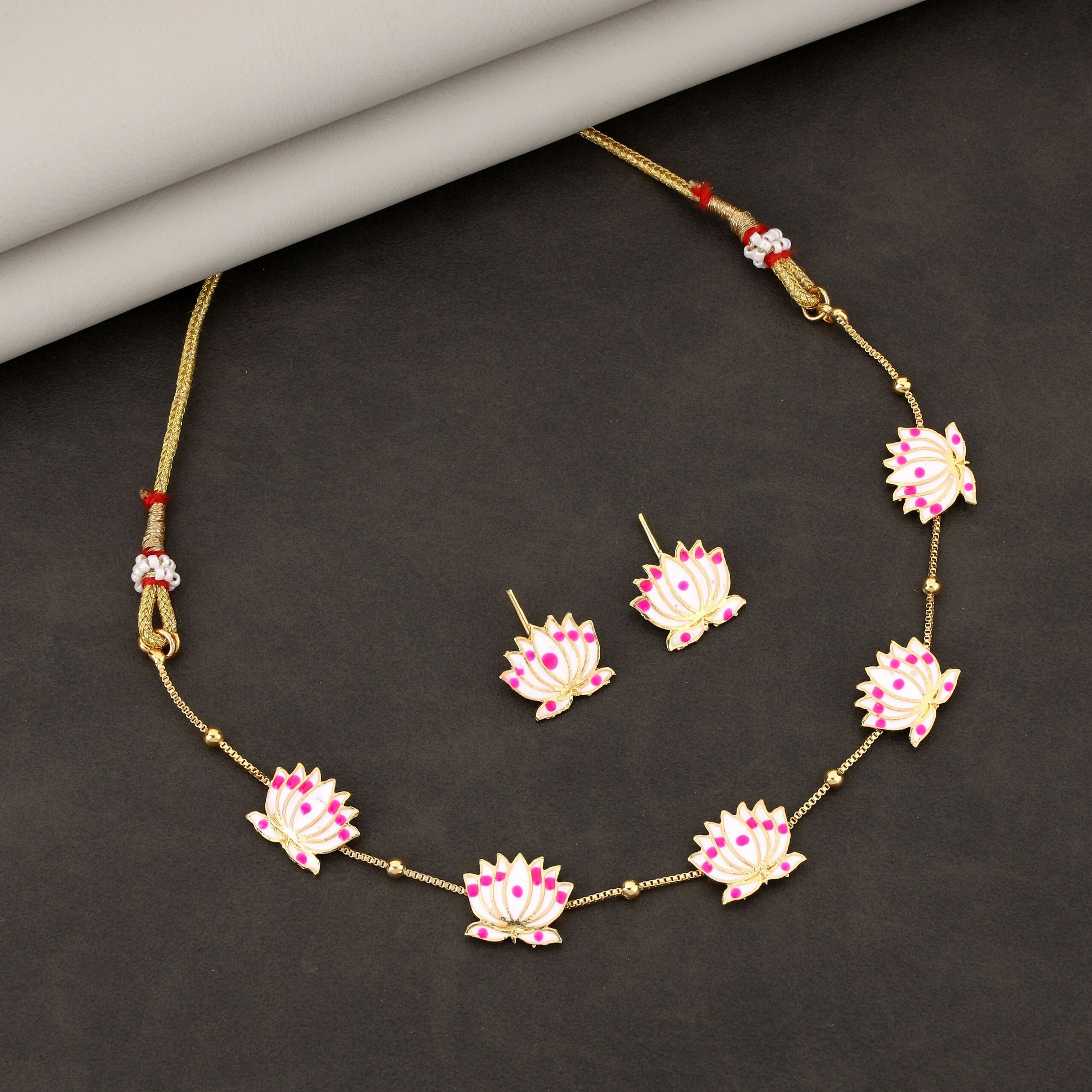 Embrace cultural elegance with this sweet and captivating gold-tone necklace and earring set. Featuring the sacred Lotus flower motif, this set offers a delicate blend of traditional design and modern wearability, perfect for daily wear, festive events, or casual outings.