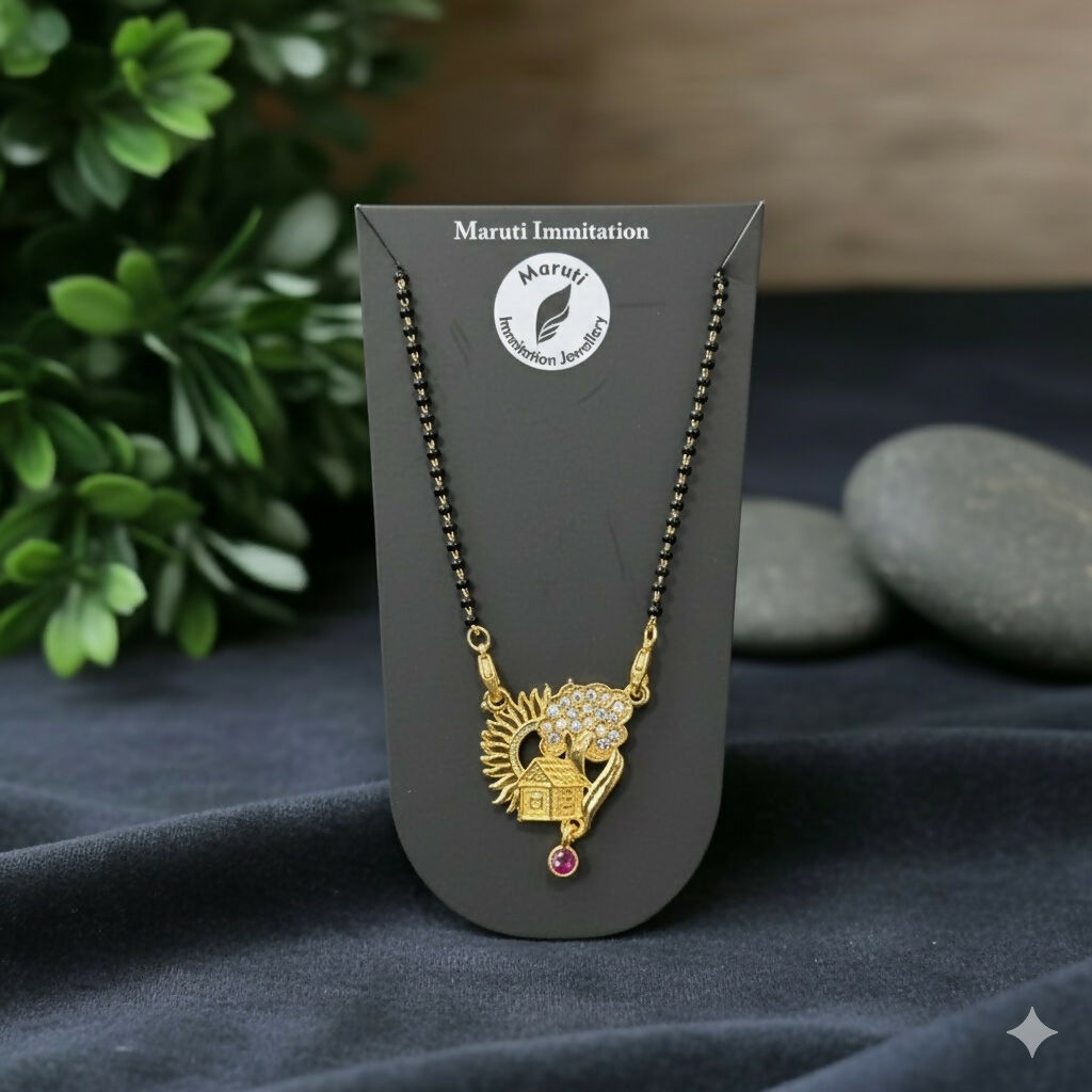 Gold-tone traditional mangalsutra, peacock-inspired pendant mangalsutra, stone studded peacock pendant, gold plated mangalsutra necklace, black bead chain jewelry, ethnic Indian necklace, women’s traditional jewelry, festive mangalsutra design, daily wear mangalsutra.