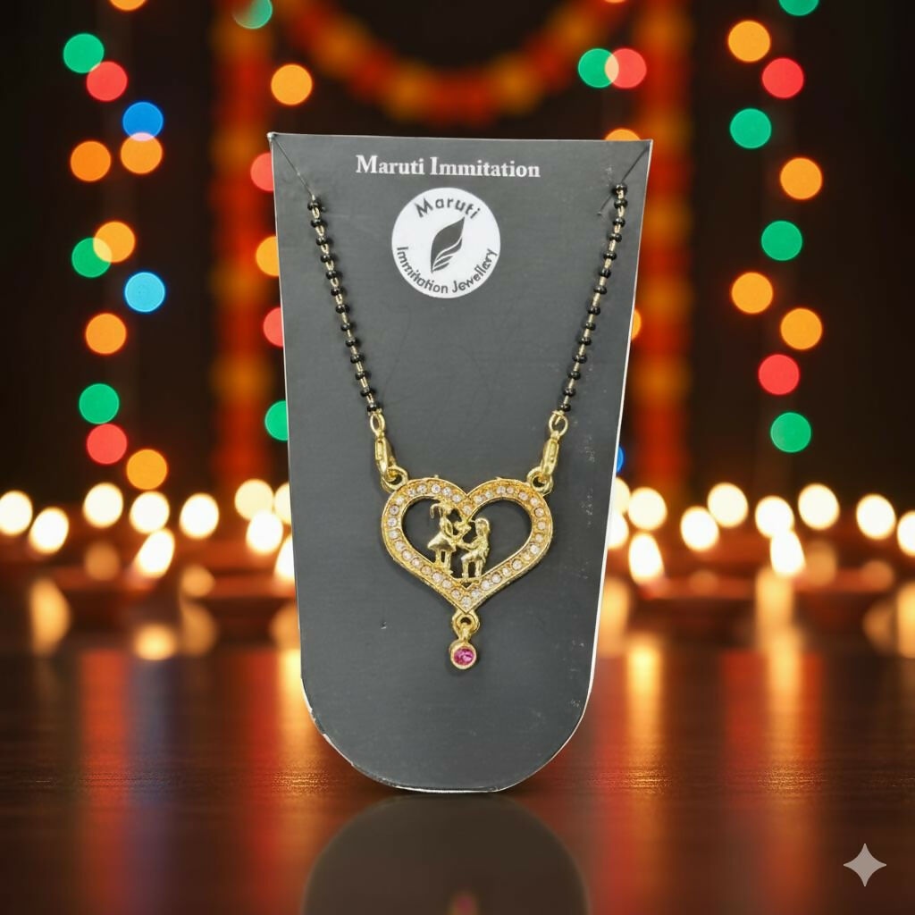 This elegant mangalsutra features a beautifully designed heart-shaped pendant embellished with shimmering stones, giving it a refined and graceful appearance. At the center is an intricately crafted couple motif that adds a romantic and meaningful touch to the design. The gold-tone finish paired with a classic black-bead chain creates a perfect balance of tradition and modern style. A small colored stone drop at the base enhances its charm, making it visually striking. Ideal for daily wear and special occasions, this mangalsutra effortlessly complements both ethnic and contemporary outfits while adding a touch of elegance to your jewellery collection.