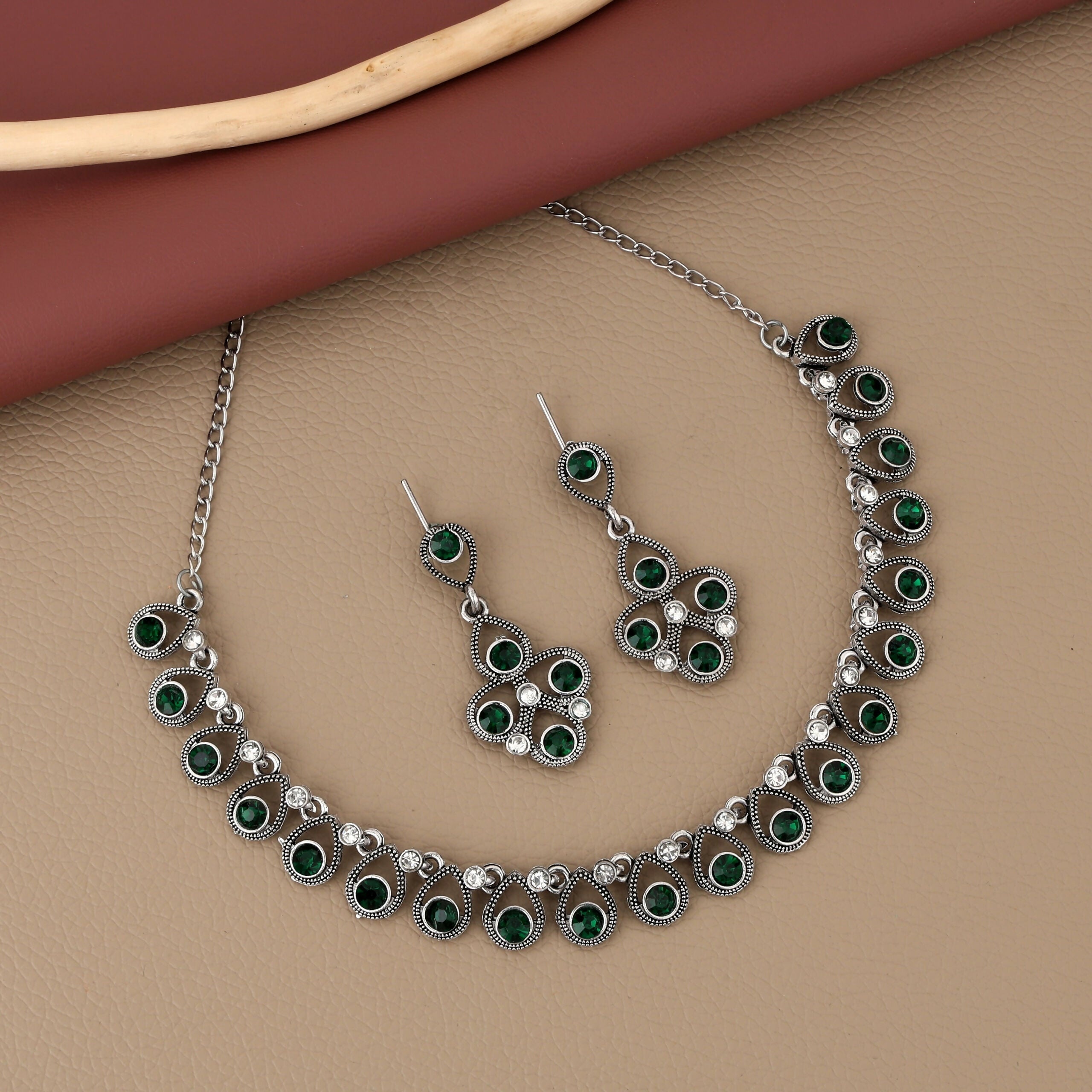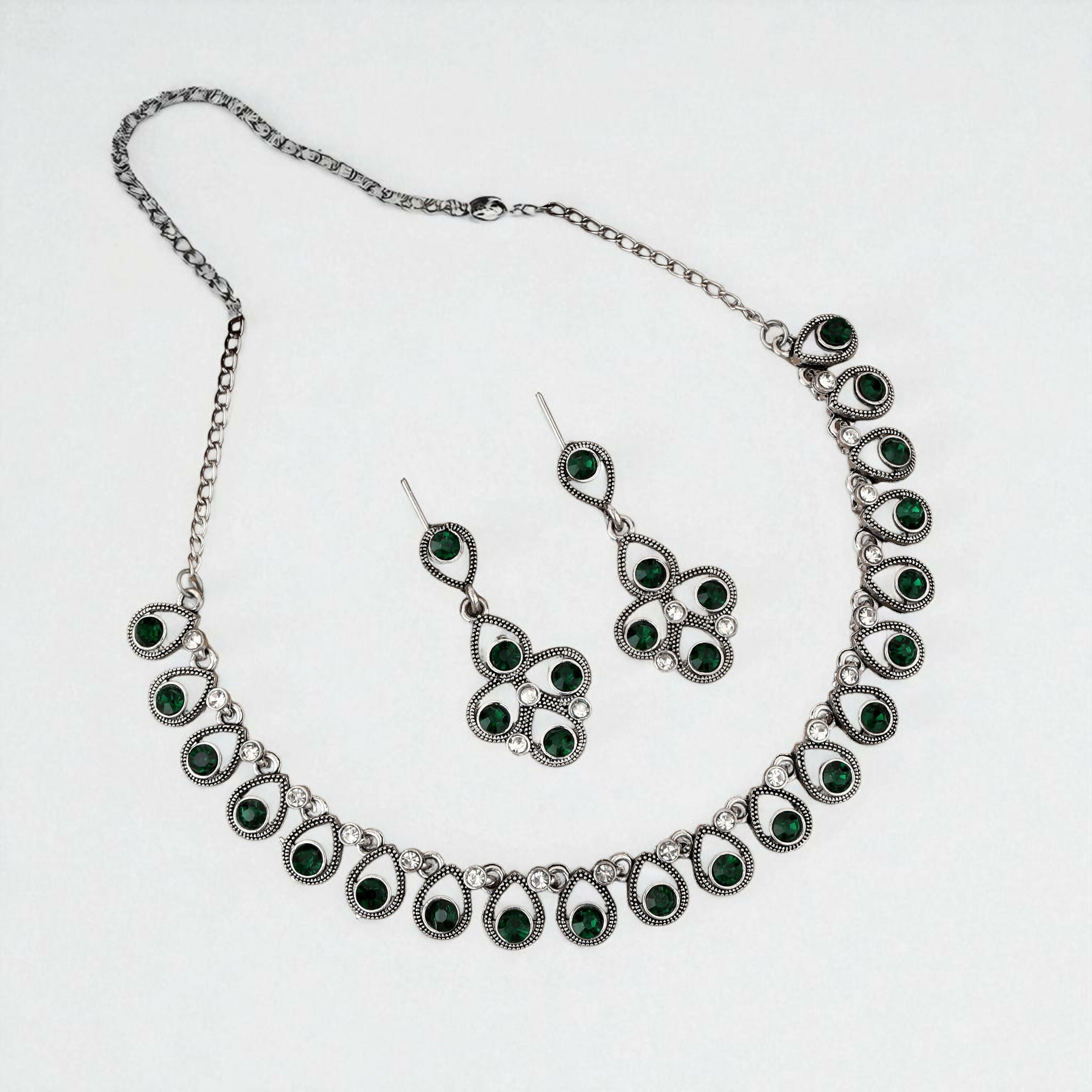 Antique Silver-Toned Choker Set with Emerald Green Stones