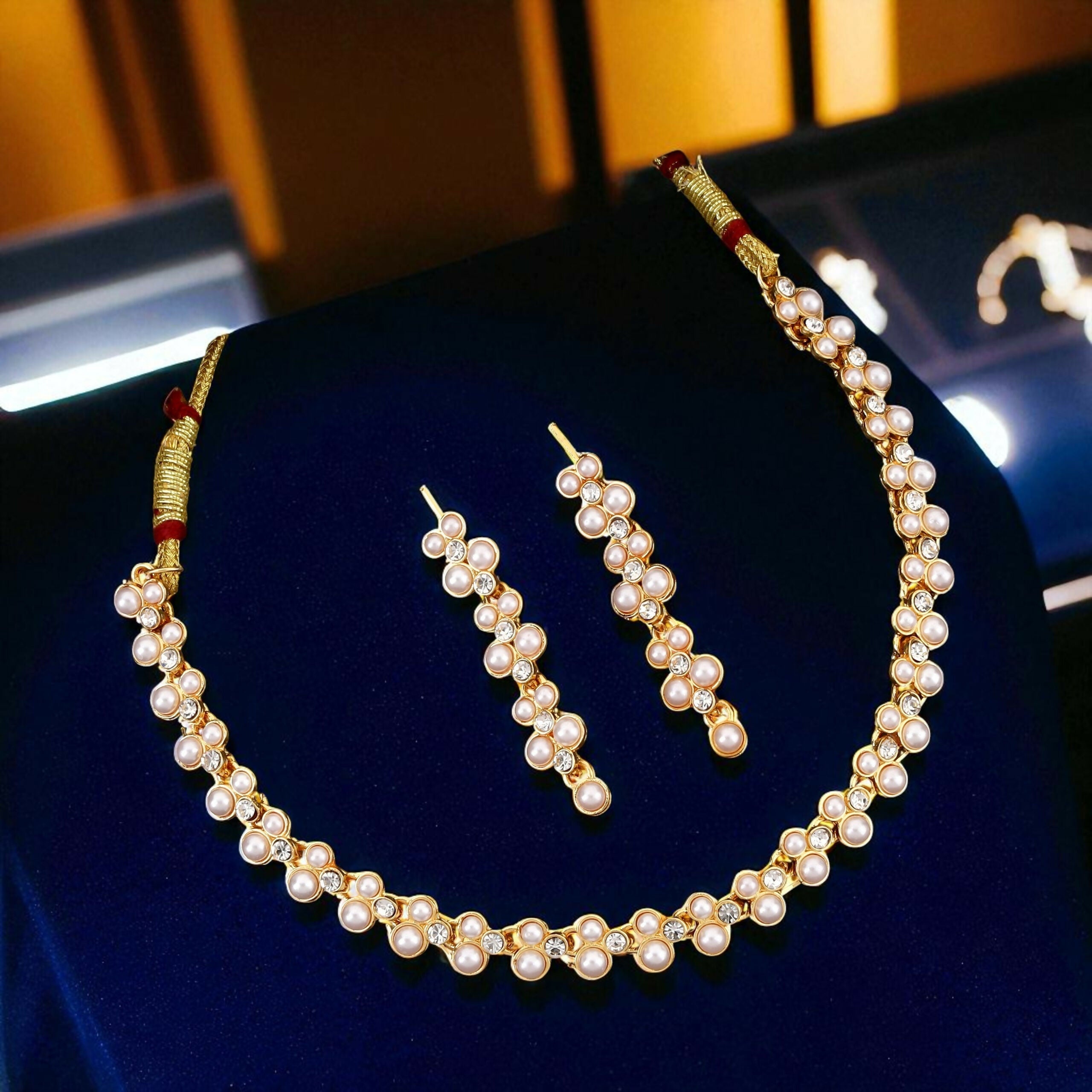 This glamorous set features a rose gold-toned necklace and matching drop earrings. The necklace is crafted from interconnected floral clusters and sparkling oval links, all encrusted with brilliant American Diamonds (AD stones). The design flows into an intricate, open-work teardrop pendant at the center. The warm rose gold finish gives this classic design a modern, romantic touch, perfect for anniversaries, cocktail parties, and sophisticated evening wear.