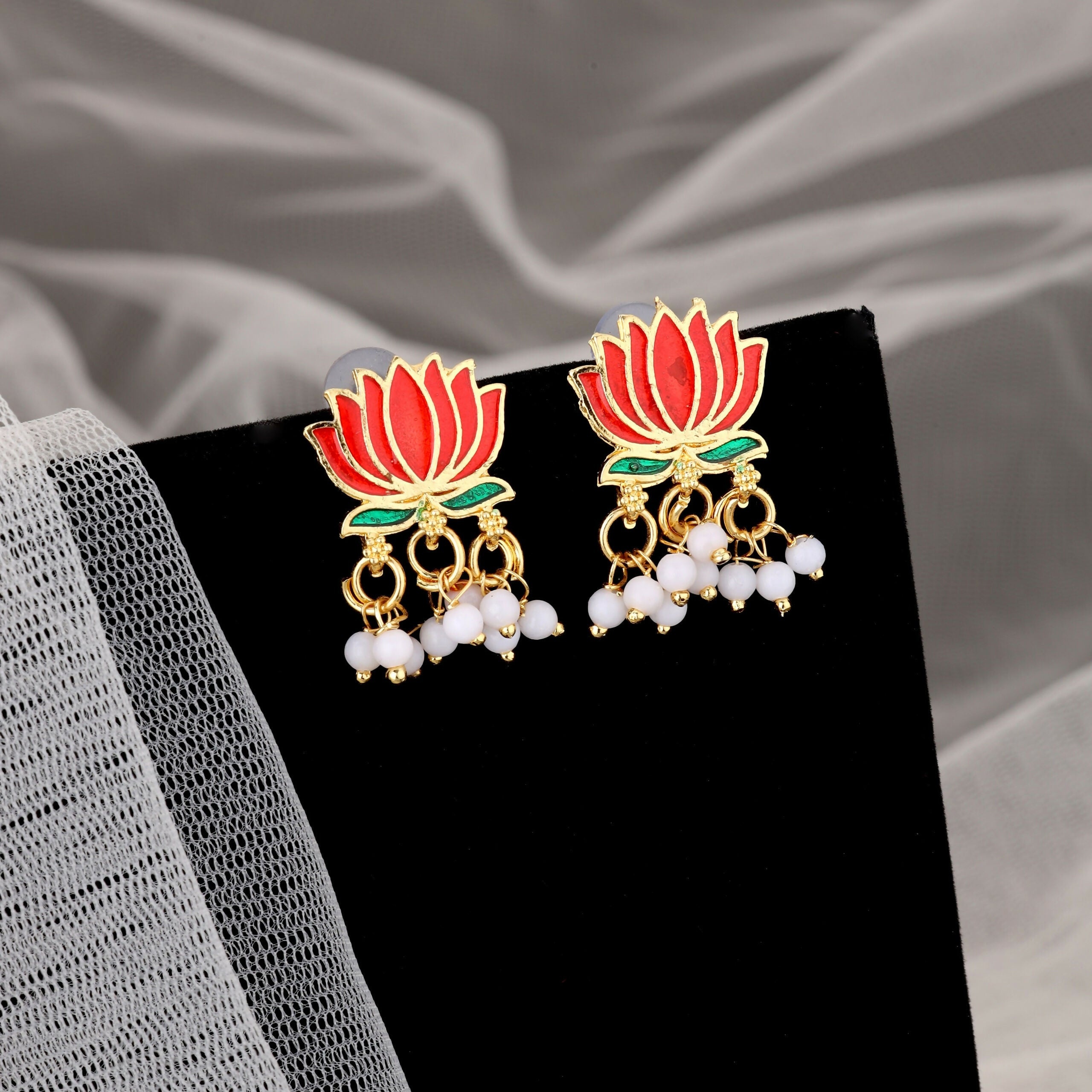 This majestic set features a thick, gold-toned chain and a prominent, ornate lotus flower pendant. The pendant is heavily encrusted with sparkling mina work and finished with a fringe of gold-toned beads. It includes matching lotus stud earrings, perfect for grand ethnic occasions.