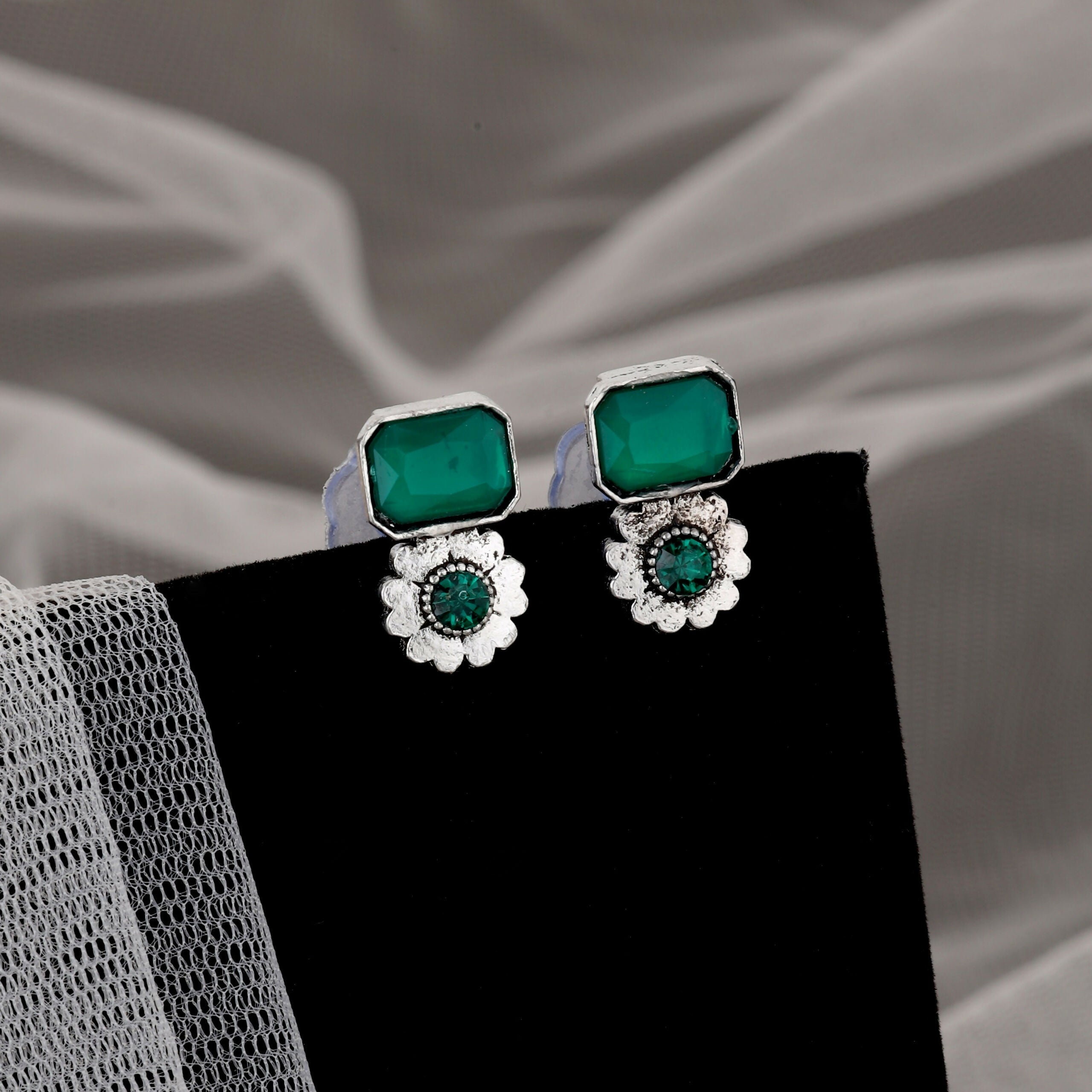 , characterized by the rich contrast between deep green stones and antique silver-toned metal.